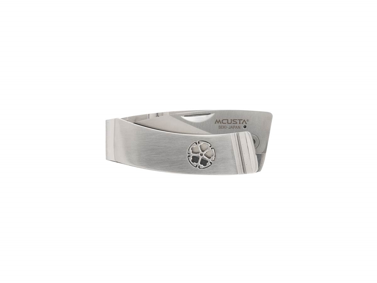 La serie di Kamon presenta coltelli con un esclusivo blocco lama scheletrato ed un robusto fermasoldi integrato. È offerto in più versioni, ciascuna con uno stemma di famiglia tradizionale giapponese (Kamon) tagliato al laser. Questo coltello misura 2,9 pollici di lunghezza da chiuso e presenta una lama AUS-8 con manico in acciaio inossidabile. Un coltello tascabile fermasoldi elegante e unico con design Kikyo integrato nella clip.
