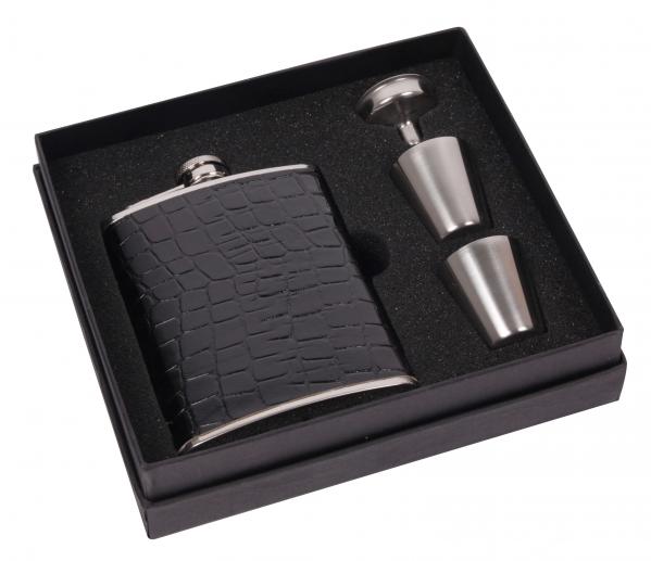 Il set con fiaschetta da 7 oz rivestita in similpelle, due bicchierini in acciaio inox e imbuto coordinato è un raffinato cofanetto pensato per chi ama concedersi un momento di piacere con stile e discrezione. Elegante e compatto, questo set è ideale per accompagnare serate speciali, viaggi, escursioni o per diventare un’idea regalo originale e curata. Ogni elemento è alloggiato in una scatola nera con interno in schiuma sagomata, che protegge e valorizza il contenuto, offrendo un’esperienza d’uso ordinata e di qualità.• Capienza Versatile: La fiaschetta ha una capacità di 7 oz (circa 200 ml), perfetta per contenere il proprio distillato preferito e condividerlo in piccoli momenti conviviali.• Rivestimento in Similpelle: Il design elegante con effetto coccodrillo nero dona un tocco di classe e raffinatezza, rendendo la fiaschetta piacevole al tatto e visivamente distintiva.• Accessori Coordinati: Il set include due bicchierini in acciaio inox e un pratico imbuto per facilitare il riempimento, garantendo un’esperienza completa e senza sprechi.• Materiali Resistenti: Tutti i componenti sono realizzati in metallo resistente e durevole, pensati per mantenere a lungo la qualità e l’integrità del contenuto.• Confezione Regalo: Il set viene fornito in una scatola nera elegante e compatta, perfetta per essere regalata o custodita in casa con ordine e discrezione.Questo set con fiaschetta in similpelle e accessori abbinati è pensato per chi desidera unire gusto, funzionalità e presentazione impeccabile. Un compagno ideale per chi ama distinguersi anche nei piccoli piaceri della vita, con oggetti pratici e curati fin nei minimi dettagli.