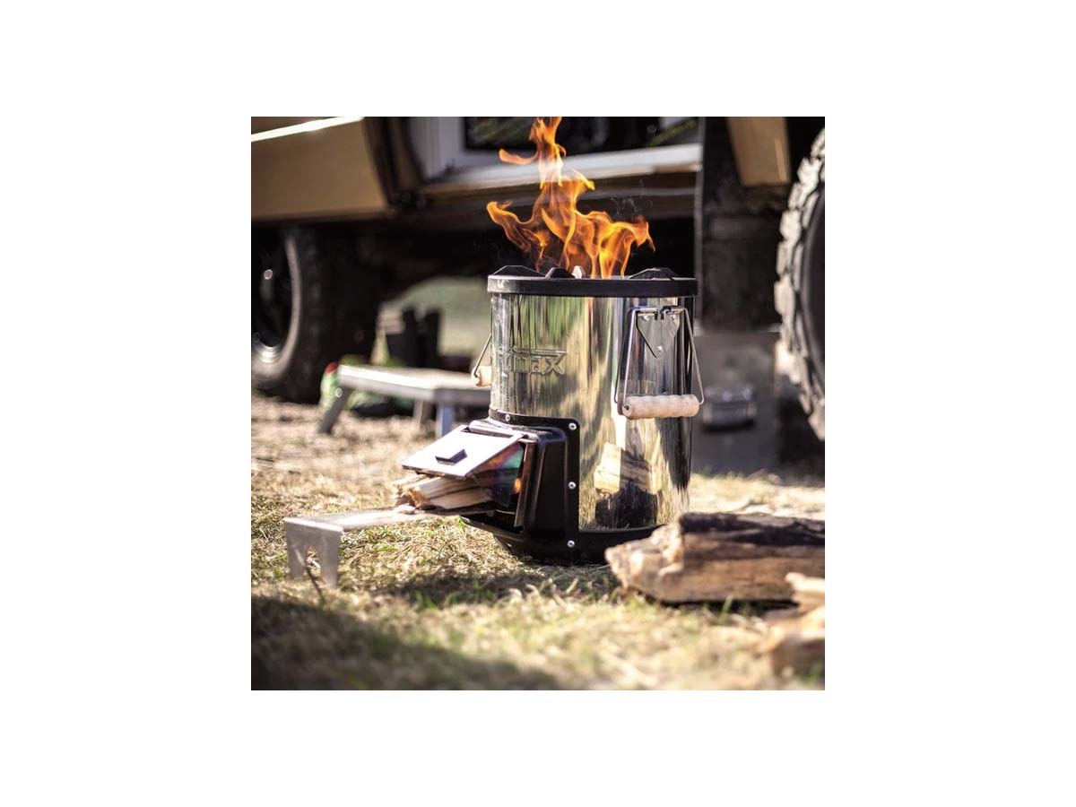 La stufa fornello "a razzo" Petromax ha una superficie di cottura in ghisa che immagazzina il calore e lo trasferisce uniformemente alla caffettiera, al braciere o alla padella in ghisa. Brucia in modo particolarmente efficace rami, ramoscelli o pigne che, mediante un supporto, si possono aggiungere in modo continuo e sicuro. Grazie al buon isolamento verso il basso, può essere posizionata su un tavolo da campeggio, perché il calore è concentrato in un piccolo spazio al centro del fornello.