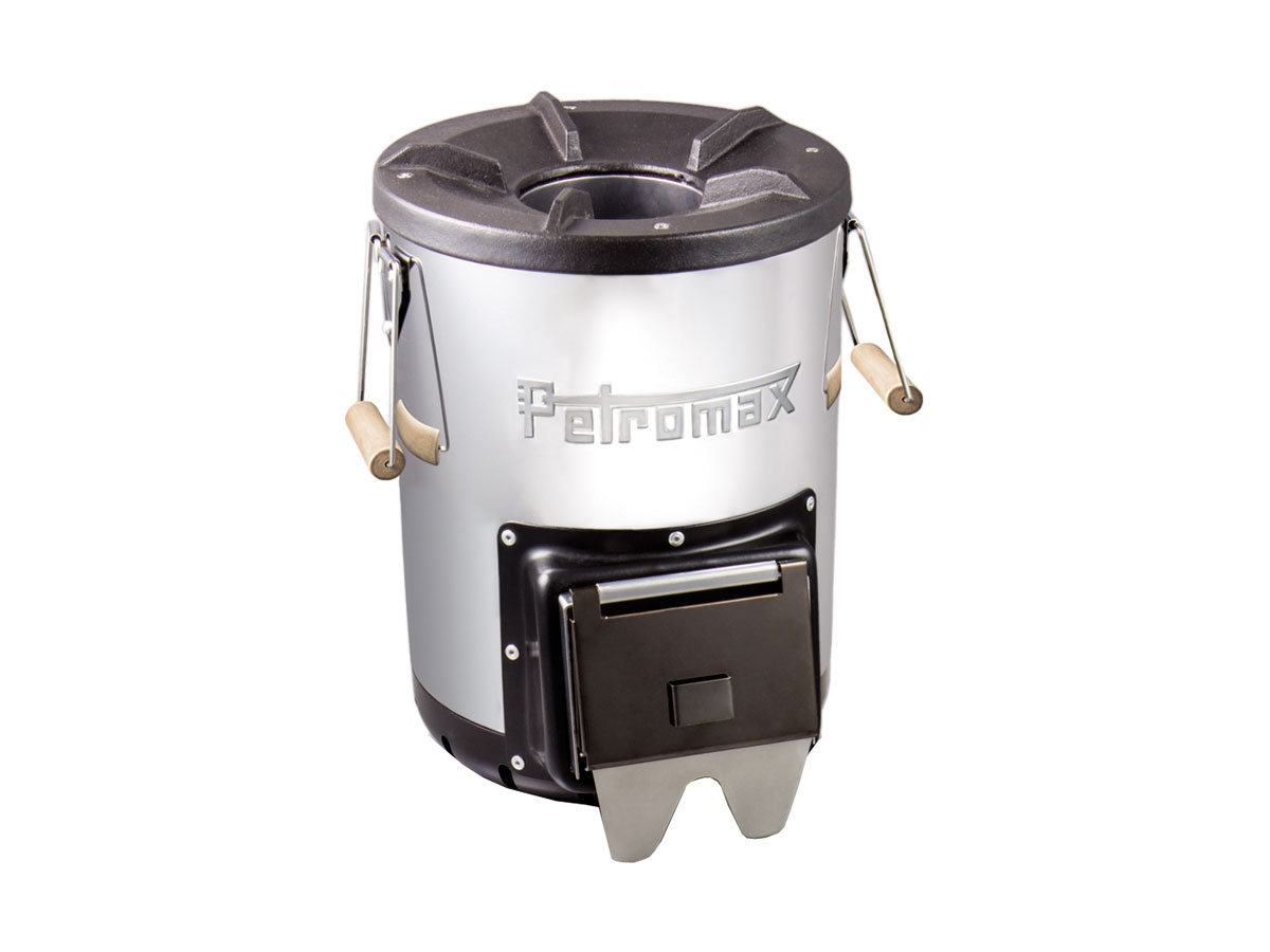 La stufa fornello "a razzo" Petromax ha una superficie di cottura in ghisa che immagazzina il calore e lo trasferisce uniformemente alla caffettiera, al braciere o alla padella in ghisa. Brucia in modo particolarmente efficace rami, ramoscelli o pigne che, mediante un supporto, si possono aggiungere in modo continuo e sicuro. Grazie al buon isolamento verso il basso, può essere posizionata su un tavolo da campeggio, perché il calore è concentrato in un piccolo spazio al centro del fornello.