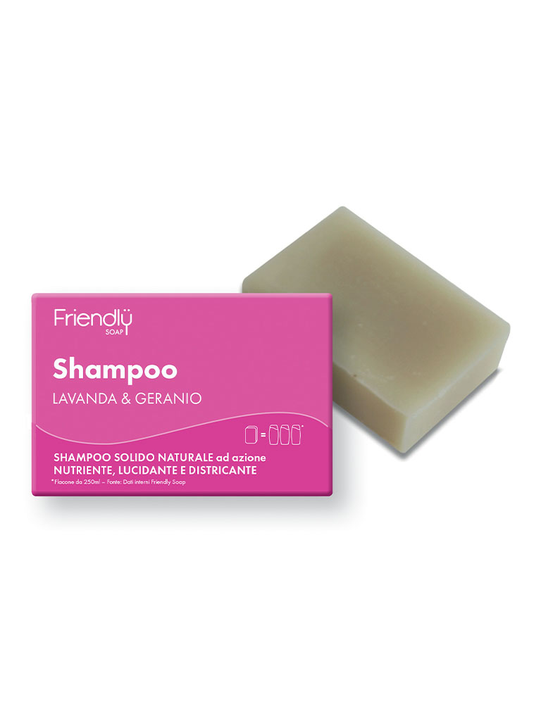 Questo shampoo solido contiene olio di ricino che, producendo una leggera e cremosa schiuma, aiuta a districare, proteggere e idratare i capelli in profondità. Gli oli essenziali di lavanda e geranio rendono l’utilizzo piacevole e rilassante.95gLe saponette ecologiche di Friendly Soap sono vegane, cruelty free e confezionate utilizzando imballaggi per sapone privi di plastica, con cartone riciclato e riciclabile. Le saponette sono create utilizzando ingredienti naturali, assicurando che la tua pelle e i tuoi capelli ne beneficeranno tanto quanto il pianeta. I saponi senza plastica sono realizzati con un processo perfettamente pulito e ogni membro del team viene pagato più del salario minimo.Permettendoti di agire per un mondo che si prende cura dell'ambiente, delle persone e degli animali.L'azienda viene riconosciuta e certificata delle seguenti dichiarazioni di sostenibilità:• Prodotti senza plasticaIl marchio non utilizza plastica vergine o riciclata in nessuno dei suoi prodotti e utilizza quasi il 100% di imballaggi primari privi di plastica.• Oltre il 50% di imballaggi riciclatiOltre la metà degli imballaggi dei prodotti primari del marchio è realizzata con materiali riciclati che sono stati recuperati, rielaborati e convertiti in nuovi materiali.• Oltre il 75% di imballaggi riciclabiliOltre il 75% degli imballaggi dei prodotti primari e secondari del marchio può essere riciclato attraverso la raccolta standard sul marciapiede o è certificato compostabile a casa.• 100% veganoIl marchio offre esclusivamente prodotti o esperienze 100% vegani e non utilizza alcun ingrediente o componente derivato da animali in nessuno dei suoi prodotti, imballaggi e processi produttivi.• Senza crudeltàIl marchio e i suoi fornitori rispettano i principi cruelty-free, il che significa che garantiscono che nessun prodotto, ingrediente o componente venga mai testato sugli animali.• Olio di palma sostenibileIl marchio deve utilizzare olio di palma sostenibile al 100% in tutti i prodotti, come evidenziato o garantito dalla certificazione Roundtable on Sustainable Palm Oil (RSPO) o ISCC – International Sustainability and Carbon Certification.• Campione della ComunitàIl marchio è coinvolto in progetti o iniziative a beneficio della comunità e che vanno oltre i loro prodotti, servizi e attività tipici per guadagni commerciali diretti.• Dipendenti responsabilizzatiIl marchio agisce per consentire ai propri dipendenti di essere più felici, più sani e vivere in modo più sostenibile.• BeneficenzaIl marchio fornisce una donazione in denaro o altro supporto tangibile a un ente di beneficenza registrato su base continuativa.• SalarioIl marchio paga il Living Wage a tutto il personale assunto direttamente, garantendo uno standard di vita dignitoso nel Regno Unito ea Londra. Il salario dignitoso reale viene calcolato annualmente in modo indipendente dalla Resolution Foundation e supervisionato dalla Living Wage Commission.• Bellezza pulitaIl marchio non utilizza ingredienti aggressivi, profumi sintetici o coloranti (inclusi coloranti di origine animale) in nessuno dei suoi prodotti.• Compensazioni di carbonioIl marchio finanzia progetti esterni che sequestrano le emissioni di anidride carbonica per compensare le proprie emissioni.• Prodotto nel Regno UnitoIl marchio produce i suoi prodotti nel Regno Unito.