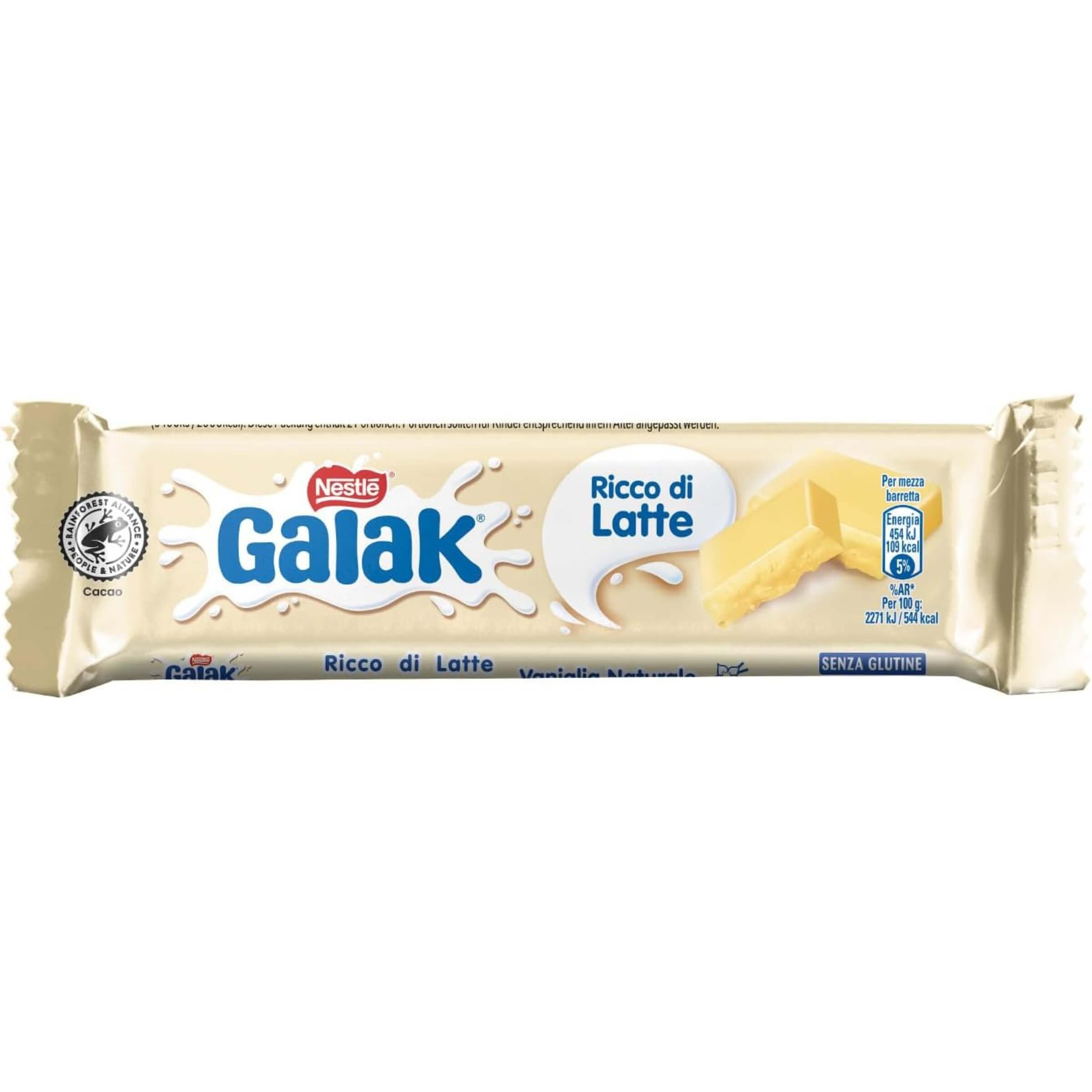 Un grande classico che continua a conquistare generazioni con la sua semplicità inconfondibile: la barretta Galak al cioccolato bianco è un concentrato di dolcezza, cremosità e gusto autentico. Realizzata con latte e vaniglia naturale, regala un'esperienza sensoriale morbida e avvolgente, perfetta per una pausa golosa in qualsiasi momento della giornata. Il suo formato compatto e pratico la rende ideale come snack da portare sempre con sé, per adulti e bambini.• Gusto iconico Galak: Una ricetta che esalta il sapore pieno del latte con la dolcezza caratteristica del cioccolato bianco, arricchita dalla delicatezza della vaniglia naturale.• Senza glutine: Prodotto certificato senza glutine, adatto anche a chi segue una dieta specifica, mantenendo intatto il piacere autentico del cioccolato.• Formato da 40 grammi: Una porzione bilanciata che soddisfa il palato senza appesantire, perfetta come merenda, dolcetto dopo i pasti o coccola quotidiana.• Alta qualità certificata: Il cacao impiegato proviene da coltivazioni sostenibili e certificate Rainforest Alliance, per un gusto che rispetta anche l’ambiente.• Espositore da 36 pezzi: Ogni confezione contiene 36 barrette singole, pronte per la vendita in negozi, bar, tabaccherie o corner snack, con un design accattivante che ne valorizza la visibilità a scaffale.La barretta Galak al cioccolato bianco è una scelta che va oltre il gusto: rappresenta un momento di piacere semplice, accessibile e sempre apprezzato. Il suo sapore unico la rende inconfondibile, mentre la praticità del formato la trasforma in uno snack versatile per ogni occasione.