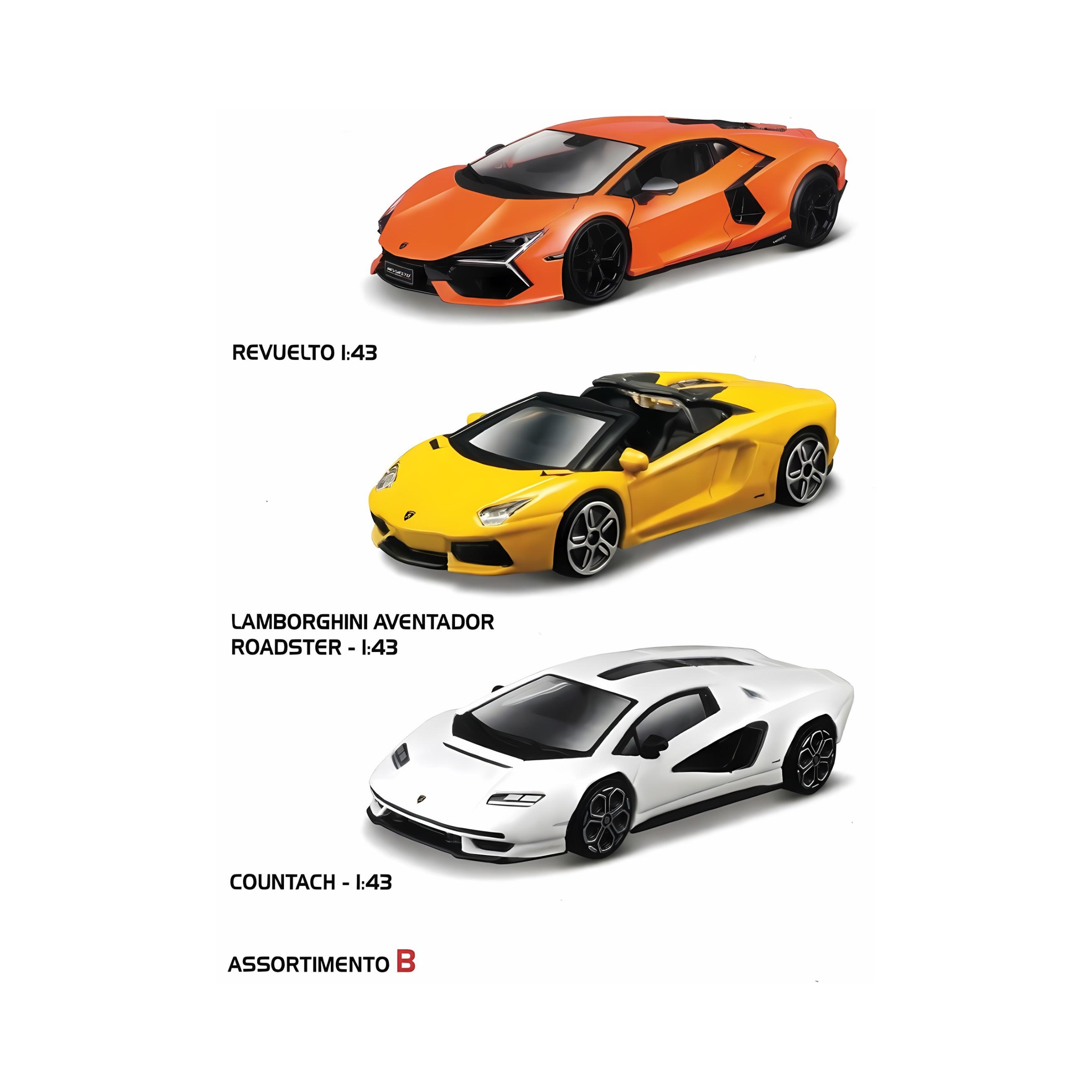 Il Gift Pack Lamborghini 3 Modellini Auto Die Cast 1:43, perfetto per gli appassionati di automobili e collezionisti. Ogni modello è realizzato con grande attenzione ai dettagli, offrendo un’esperienza di alta qualità.• Dettagli Realistici: Ogni modellino Lamborghini riproduce fedelmente le caratteristiche distintive delle supercar originali. Dai fanali anteriori al disegno dei cerchi, i dettagli interni ed esterni sono curati con precisione per riflettere l’autenticità dei veicoli.• Materiali di Alta Qualità: I modelli sono realizzati in metallo pressofuso con parti in plastica, garantendo durabilità e una finitura superiore. La robustezza dei materiali utilizzati assicura che questi modellini possano resistere all’usura del tempo.• Scala: La scala 1:43 offre un ottimo equilibrio tra dimensioni e dettagli, rendendo questi modelli perfetti sia per l'esposizione che per il gioco. Le dimensioni compatte permettono di aggiungere facilmente questi pezzi a qualsiasi collezione.• Design Accattivante: Il set include tre modelli Lamborghini in diverse colorazioni e varianti, tra cui la Centenario, l'Huracán Coupé e l'Urus. Ogni modello cattura l’occhio con la sua estetica sportiva e sofisticata.• Confezione Regalo Elegante: I modellini sono presentati in una confezione regalo elegante, ideale per fare un regalo a un appassionato di automobili o per aggiungere un tocco di classe alla propria collezione.• Ampia Selezione: Questo gift pack include 2 differenti assortimenti:Assortimento A:Lamborghini CentenarioLamborghini Aventador CoupeLamborghini UrusAssortimento B:Lamborghini RevueltoLamborghini Aventador RoadsterLamborghini Countach• Marchio Bburago: Bburago è sinonimo di qualità e precisione nella produzione di modelli die cast. Con questo set regalo, Bburago continua a offrire prodotti che soddisfano le aspettative degli appassionati di automobili.Il Gift Pack Lamborghini 3 Modellini Auto Die Cast 1:43 è la scelta perfetta per chi desidera aggiungere un pezzo di storia automobilistica alla propria collezione. Con dettagli accurati, materiali di alta qualità e un design affascinante, questi modelli sono destinati a diventare elementi centrali nella tua esposizione.
