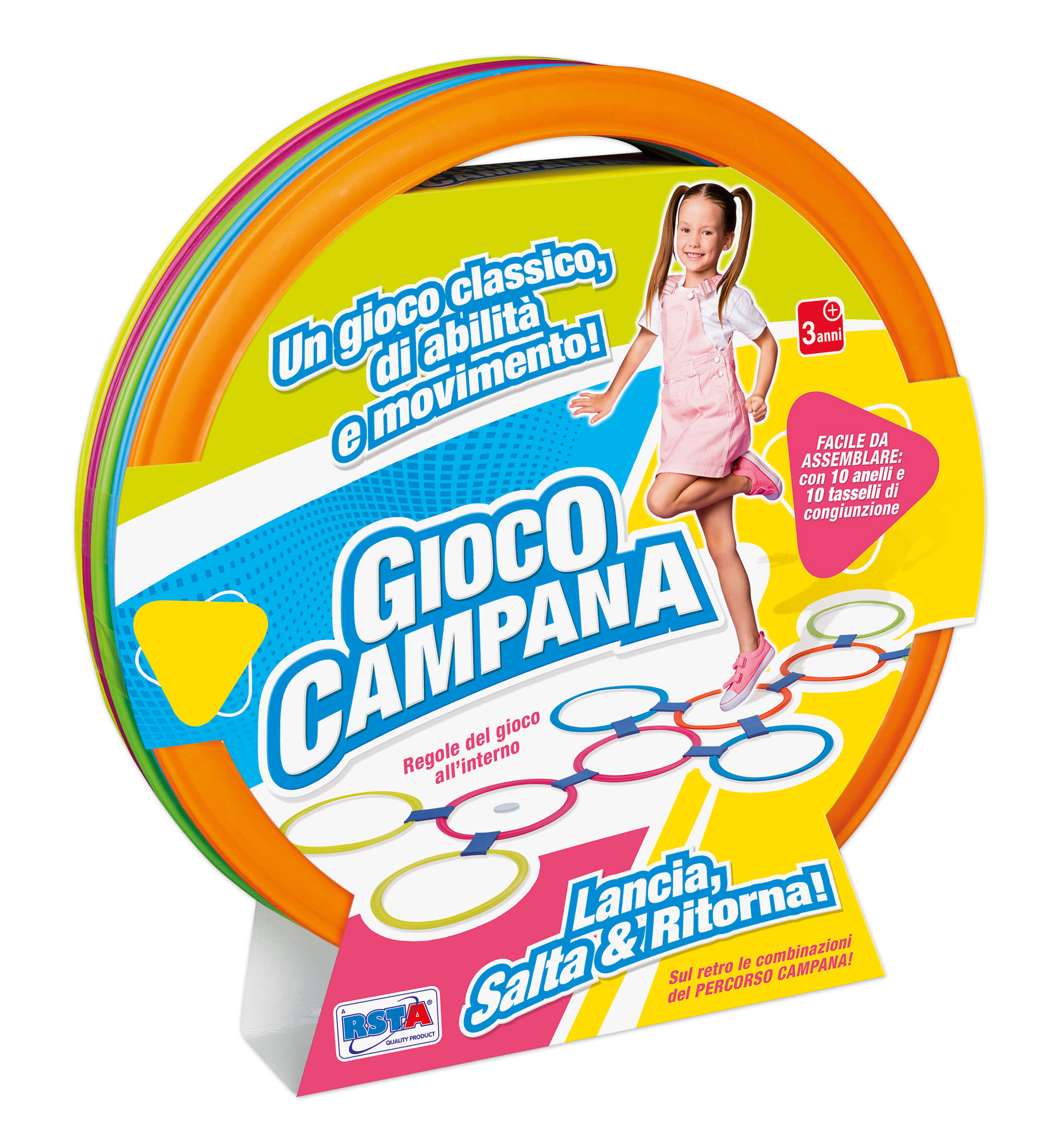Questo gioco è facile da assemblare e include 10 cerchi e 10 tasselli di congiunzione. La tua missione sarà quella di lanciare, saltare e far ritornare il tuo cerchio attraverso il percorso della campana.