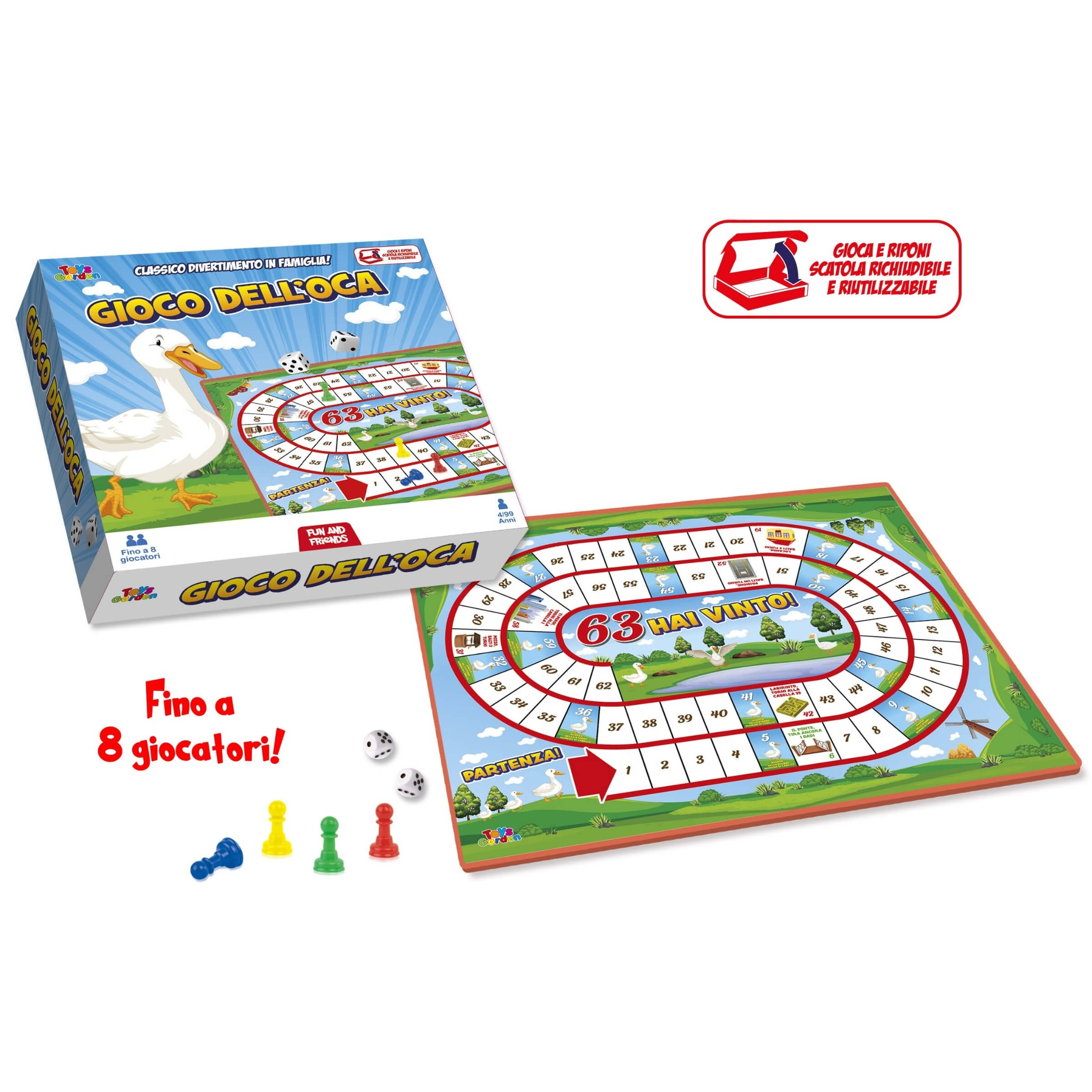 La confezione include tutto il necessario per iniziare subito: il tabellone con il tracciato numerato fino alla casella 63, due dadi e 8 pedine colorate. Il formato compatto e richiudibile permette di riporre il gioco comodamente dopo l’uso, senza disperdere i pezzi. Una soluzione ideale per la casa, le vacanze o per essere trasportato facilmente ovunque.