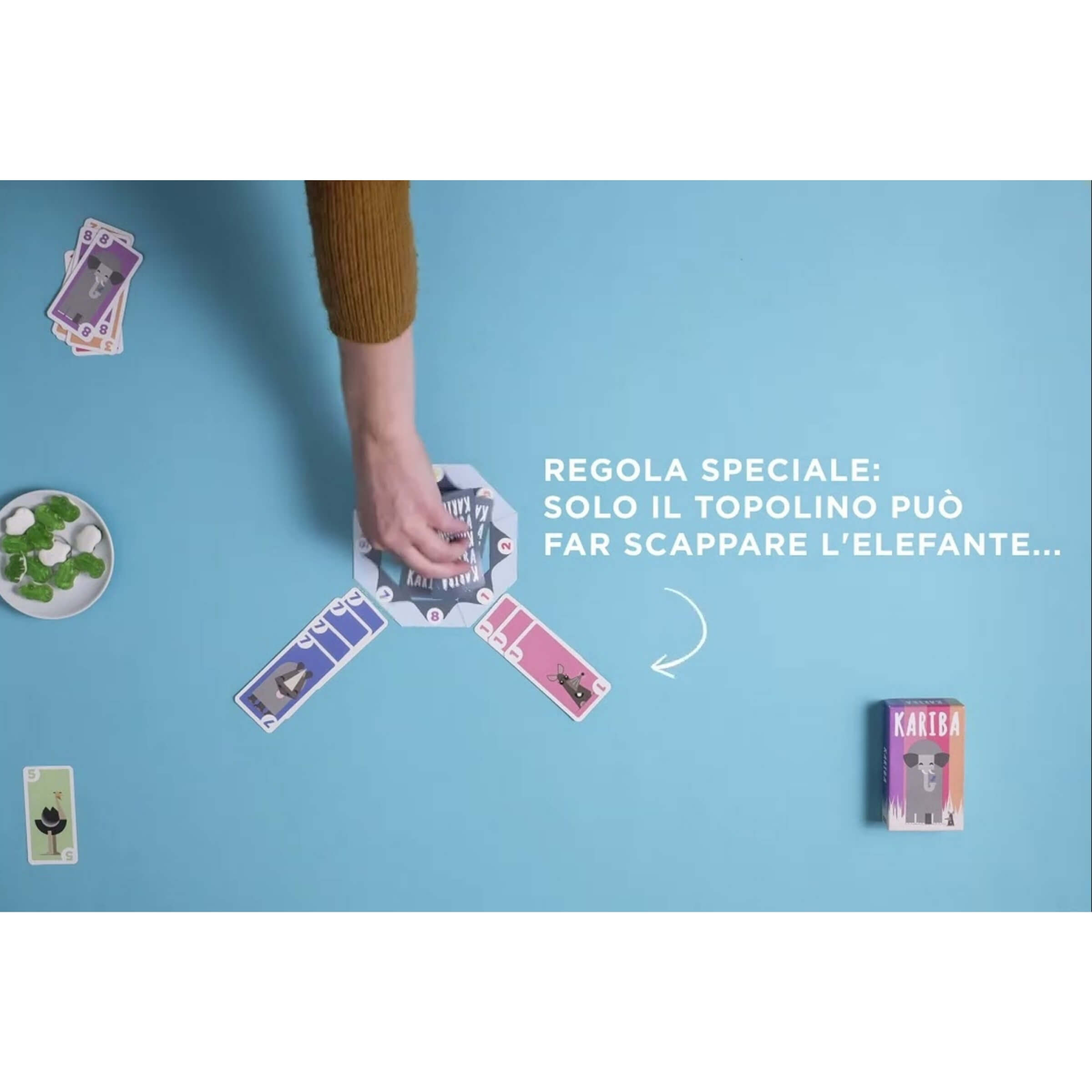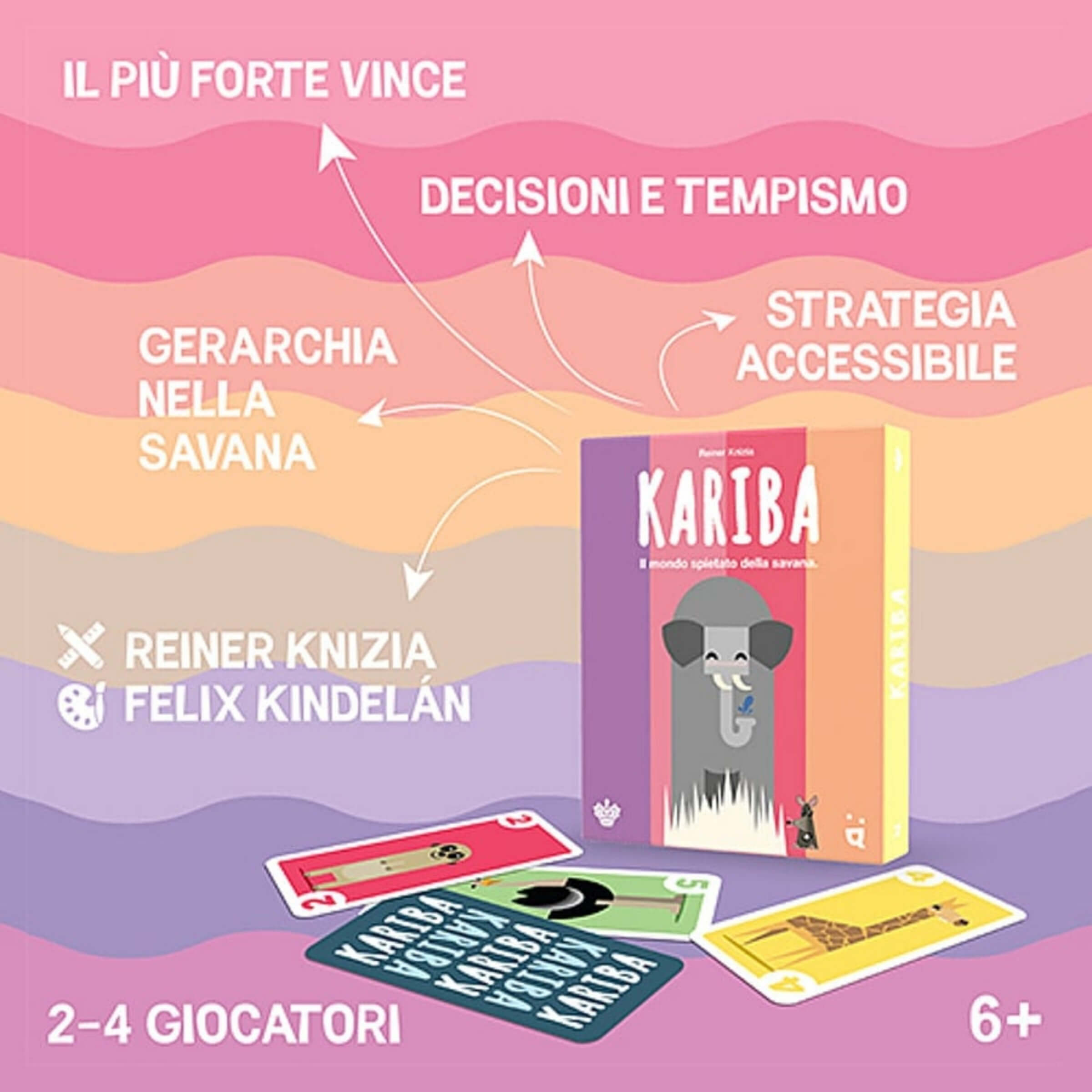 Kariba è il gioco di carte che racconta la dura legge della natura, dove solo l'animale più astuto riesce a prevalere. Nel cuore della savana, tutti cercano di avvicinarsi all'unica pozza d'acqua disponibile, ma il diritto di bere non è garantito a nessuno. Gli elefanti scacciano i rinoceronti, i rinoceronti scacciano i topi, ma anche il più temibile degli elefanti deve temere il piccolo topo. Un equilibrio delicato e imprevedibile che regala a ogni partita nuove emozioni, strategie inaspettate e sfide avvincenti per tutta la famiglia.• Scopo del gioco: Il tuo obiettivo è raccogliere il maggior numero di carte possibile. Per farlo, dovrai giocare strategicamente la carta dell'animale giusto al momento giusto, cercando di conquistare la pozza d'acqua e di scacciare gli avversari prima che siano loro a scacciare te.• Meccanica semplice ma profonda: Le regole sono immediate e intuitive, rendendo Kariba accessibile a giocatori di tutte le età. Ma dietro la semplicità si nasconde una sfida continua tra rischio e opportunità, dove ogni carta giocata può ribaltare l'esito della partita.• La catena della paura: In Kariba, ogni animale può prevalere su un altro, in un ciclo senza fine. L'elefante scaccia il rinoceronte, il rinoceronte il topo, e il topo l'elefante. Questa dinamica unica crea partite cariche di tensione e imprevedibilità, dove anche il più piccolo può avere la meglio sul più grande.• Variante avanzata per esperti: Per chi desidera aumentare la profondità del gioco, è prevista una variante avanzata che offre ai giocatori maggiori possibilità di controllo e strategia, rendendo ogni mossa ancora più significativa.• Contenuto della confezione: All'interno troverai 64 carte illustrate con cura e una pozza d'acqua centrale che rappresenta il cuore della competizione. Tutti gli elementi sono progettati per offrire una durata nel tempo e un'esperienza di gioco sempre fresca.• Sicurezza e avvertenze: Prodotto non adatto ai bambini di età inferiore ai 3 anni a causa della possibile creazione di piccole parti che se ingerite o inalate potrebbero causare soffocamento. Si consiglia di conservare l’imballo per eventuali consultazioni future.Kariba è piu di un semplice gioco di carte. È una sfida di astuzia e tempismo ambientata nella savana, capace di far vivere emozioni intense a ogni turno. Facile da apprendere, rapido da giocare, ma sempre difficile da padroneggiare, rappresenta il perfetto equilibrio tra semplicità e strategia, regalando a ogni partita momenti di pura competizione e divertimento autentico.