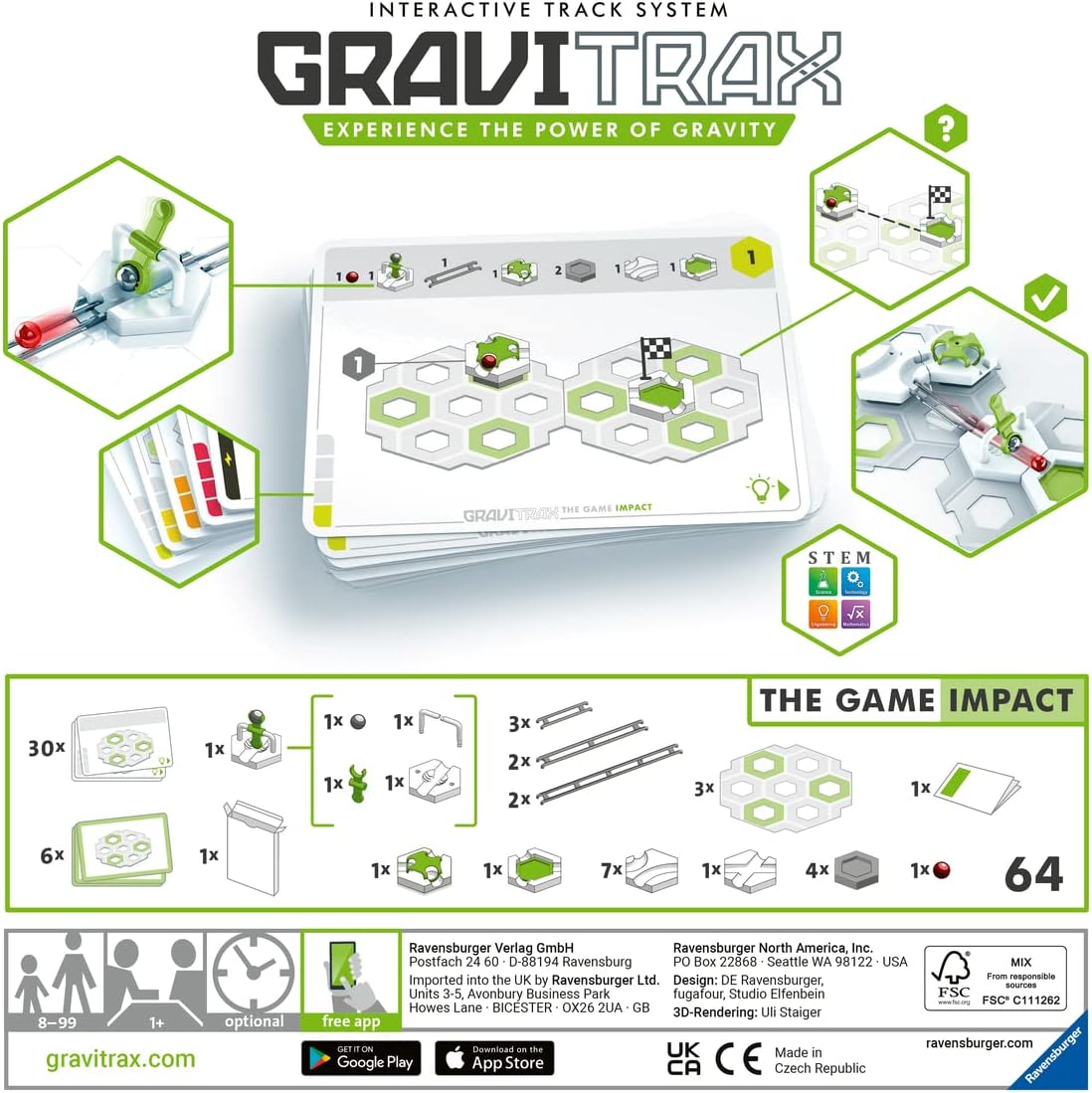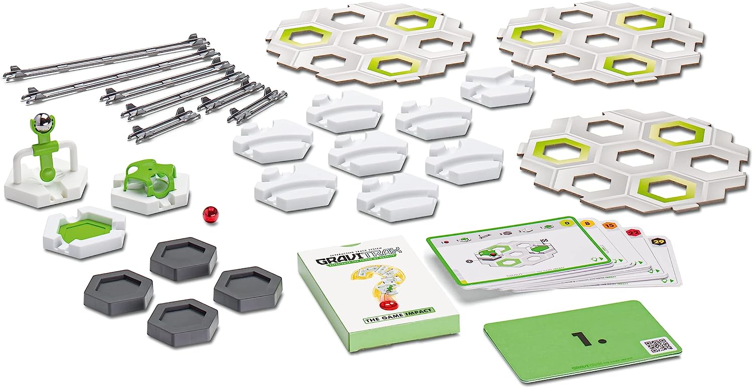 1 manuale di istruzioni e 1 di soluzioni, 30 carte sfida, 3 blocchi esagonali, 4 blocchi alti, 7 elementi curvi, 1 biglia, 1 elemento di partenza, 1 meta, 1 marmo, 1 accessorio martello, 1 incrocio, 1 elemento di base, 7 binari Trenta sfide emozionanti guidate dalle carte sfida! Le 27 componenti del gioco tra cui l’accessorio Hammer, 4 blocchi verticali, 7 curve, 1 incrocio, 1 biglia e tante altre possono essere utilizzate in tutte le piste GraviTrax! GraviTrax è un gioco innovativo ed educativo, permette infatti di apprendere concetti legati alla gravità, alla cinetica e al magnetismo coinvolgendo e facendo divertire, attraverso la costruzione delle proprie piste e percorsi, bambini e adulti GraviTrax è un gioco di costruzione STEM con cui potrai liberare la tua creatività costruendo un fantastico mondo di percorsi La possibilità di costruire piste di diversi livelli di difficoltà rende GraviTrax divertente e i pezzi aggiuntivi come le espansioni e gli accessori permettono di aumentare il divertimento