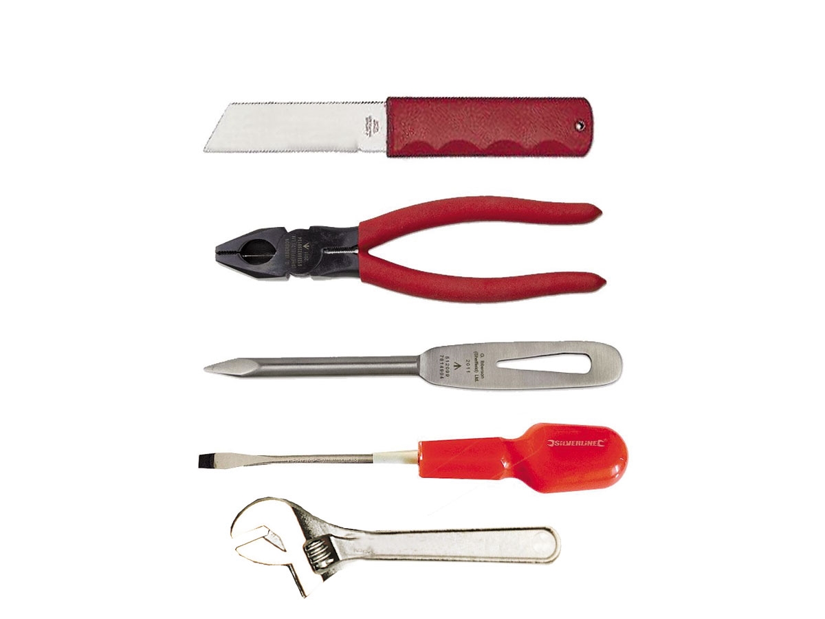 - Coltello con filo seghettato (lama cm 10)- Pinza- Cacciavite- Scioglinodi- Chiave inglese- Fodero in cuoio