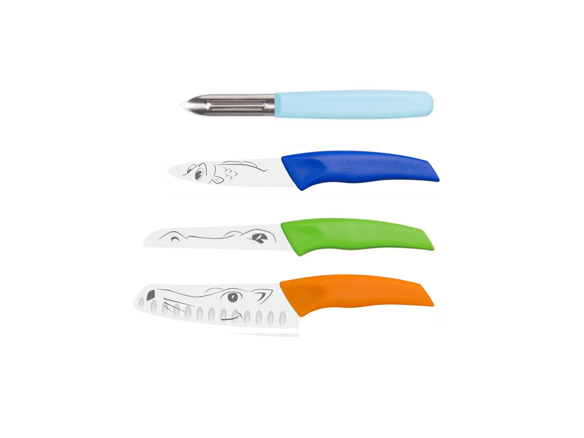 I coltelli hanno la punta affilata, arrotondata e incise con divertenti motivi. I manici in polipropilene sono ergonomici e in vari colori.
