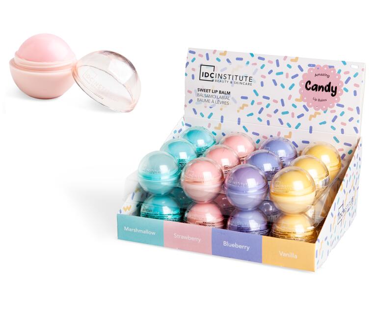 Porta sempre con te un tocco di idratazione e divertimento con il Candy Sweet Lip Balm di IDC Institute! Questo balsamo labbra dal design originale con divertenti emoticon unisce cura e protezione in un formato pratico e colorato, perfetto per ogni occasione.• 4 fragranze irresistibili: un assortimento di Pesca, Vaniglia, Fragola e Mora, per labbra morbide e delicatamente profumate.• Idratazione profonda e nutrimento: una formula arricchita con ingredienti emollienti che proteggono e ammorbidiscono le labbra, prevenendo secchezza e screpolature.• Texture leggera e confortevole: si applica facilmente e crea una barriera protettiva senza ungere, donando alle labbra un aspetto sano e luminoso.• Formato pratico da 10g: perfetto da tenere in borsa, nello zaino o nel beauty case per un tocco di idratazione sempre a portata di mano.• Espositore con 24 pezzi: ideale per punti vendita, profumerie e negozi di cosmetici, con una selezione completa delle 4 profumazioni più amate.Il Candy Sweet Lip Balm di IDC Institute è la soluzione perfetta per idratare e proteggere le labbra con un tocco di allegria. Un’idea regalo originale e un piccolo lusso quotidiano per coccolare le labbra con dolci fragranze e un’idratazione duratura.Misure del prodotto: 4 x 4 x 4 cm
