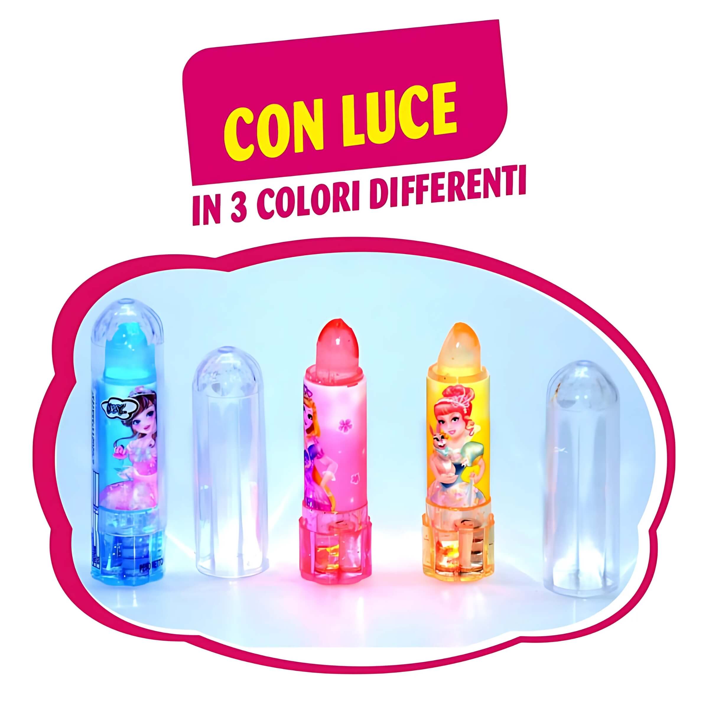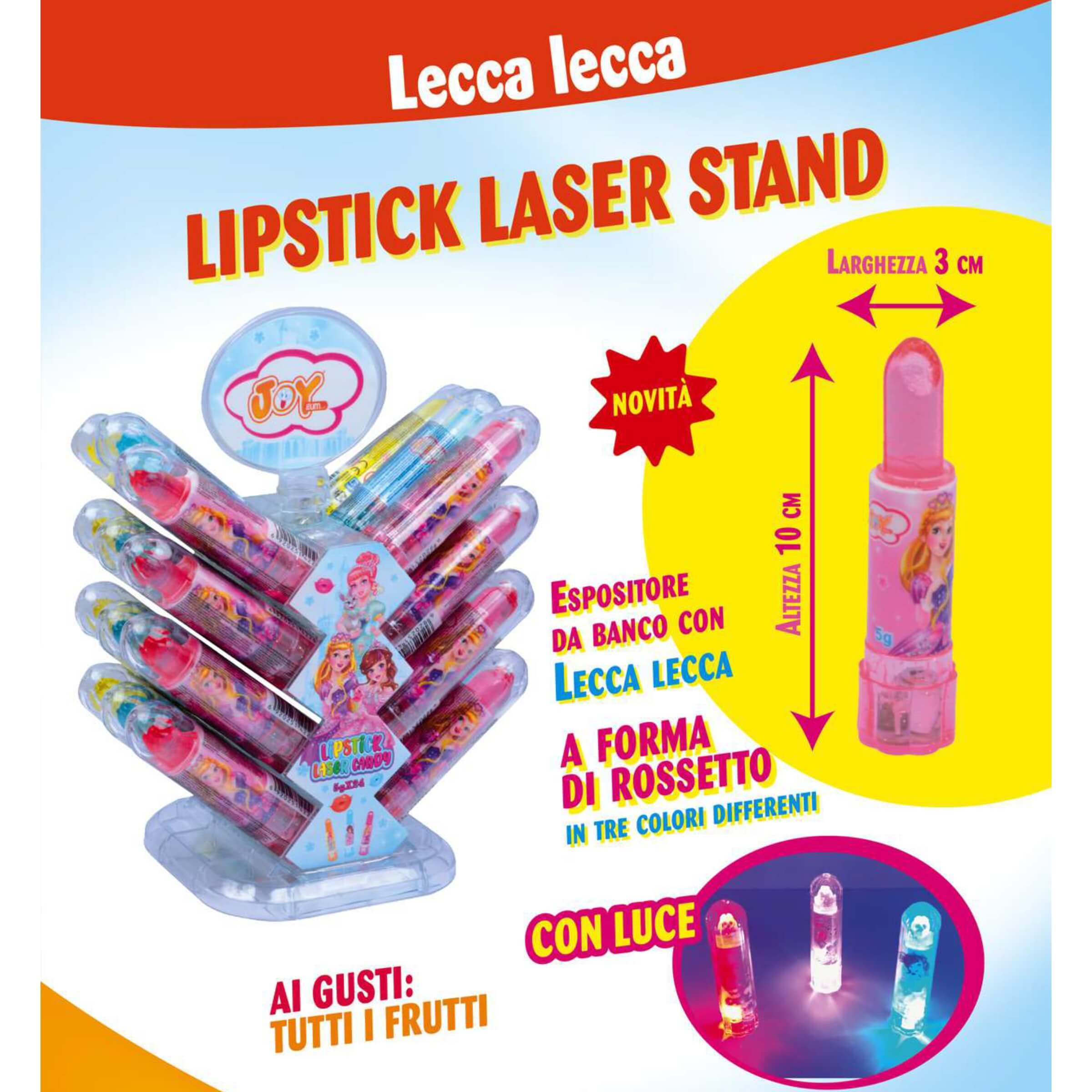 Quando il gusto incontra l’immaginazione, nascono prodotti capaci di catturare l’attenzione al primo sguardo. Il lecca lecca Joygum Lipstick Laser è un'esperienza multisensoriale che unisce dolcezza, gioco e luce in un unico oggetto. Il suo design originale a forma di rossetto lo rende subito riconoscibile e irresistibile agli occhi dei più piccoli, mentre l’effetto luminoso integrato in tre colori differenti ne amplifica l’attrattiva. Questo prodotto è pensato per essere esposto su banconi e scaffali in modo ordinato e scenografico, grazie all’apposito stand verticale incluso. Ideale per tabaccherie, chioschi, cartolerie e punti vendita che desiderano stupire con articoli fuori dal comune.• Formato rossetto con luce: Ogni lecca lecca è contenuto in un guscio rigido dalla forma di un vero rossetto, con luce LED attivabile alla base che si illumina in tre tonalità diverse.• Gusto tutti i frutti: La caramella è aromatizzata con un mix fruttato vivace e dolce, pensato per soddisfare i gusti dei bambini con una nota fresca e piacevole.• Dimensioni compatte e giocose: Il corpo misura circa 10 centimetri in altezza e 3 centimetri di diametro, rendendolo maneggevole e facilmente trasportabile anche nelle tasche dei più piccoli.• Peso singolo 5,9 grammi: Ogni pezzo contiene un lecca lecca compatto, pensato per un consumo singolo, con una durata ideale per un momento di pausa gustoso e divertente.• Espositore da banco da 24 pezzi: Il display incluso è strutturato per contenere 24 unità, disposte in modo ordinato e visivamente efficace, ideale per punti vendita con spazi ridotti ma ad alta visibilità.Con il suo mix di colori, luci e sapore, il Joygum Lipstick Laser rappresenta un piccolo universo di fantasia da offrire al pubblico più giovane. Un prodotto che va oltre la semplice caramella, trasformandosi in un oggetto da collezionare, mostrare e condividere. Perfetto per chi vuole regalare un sorriso con un formato innovativo e un tocco di magia.