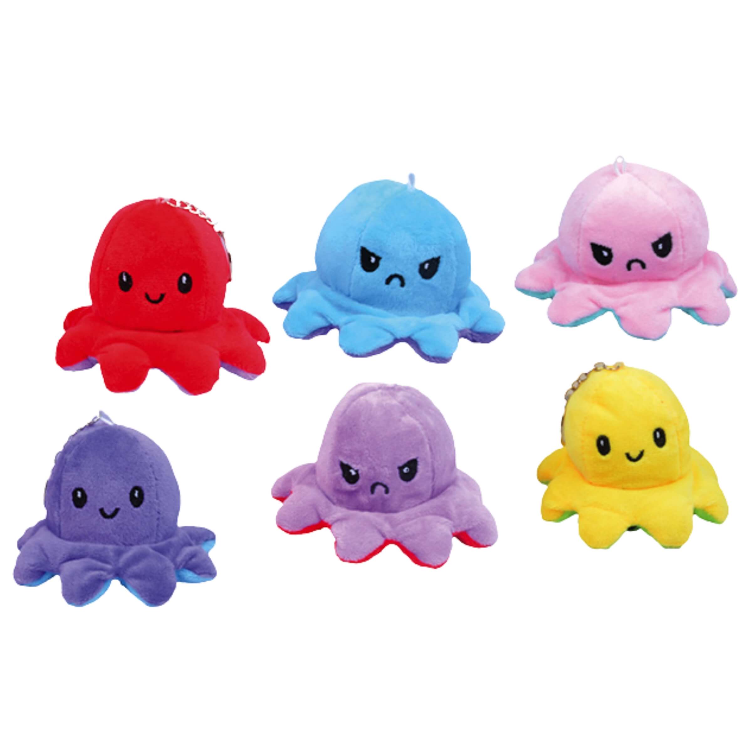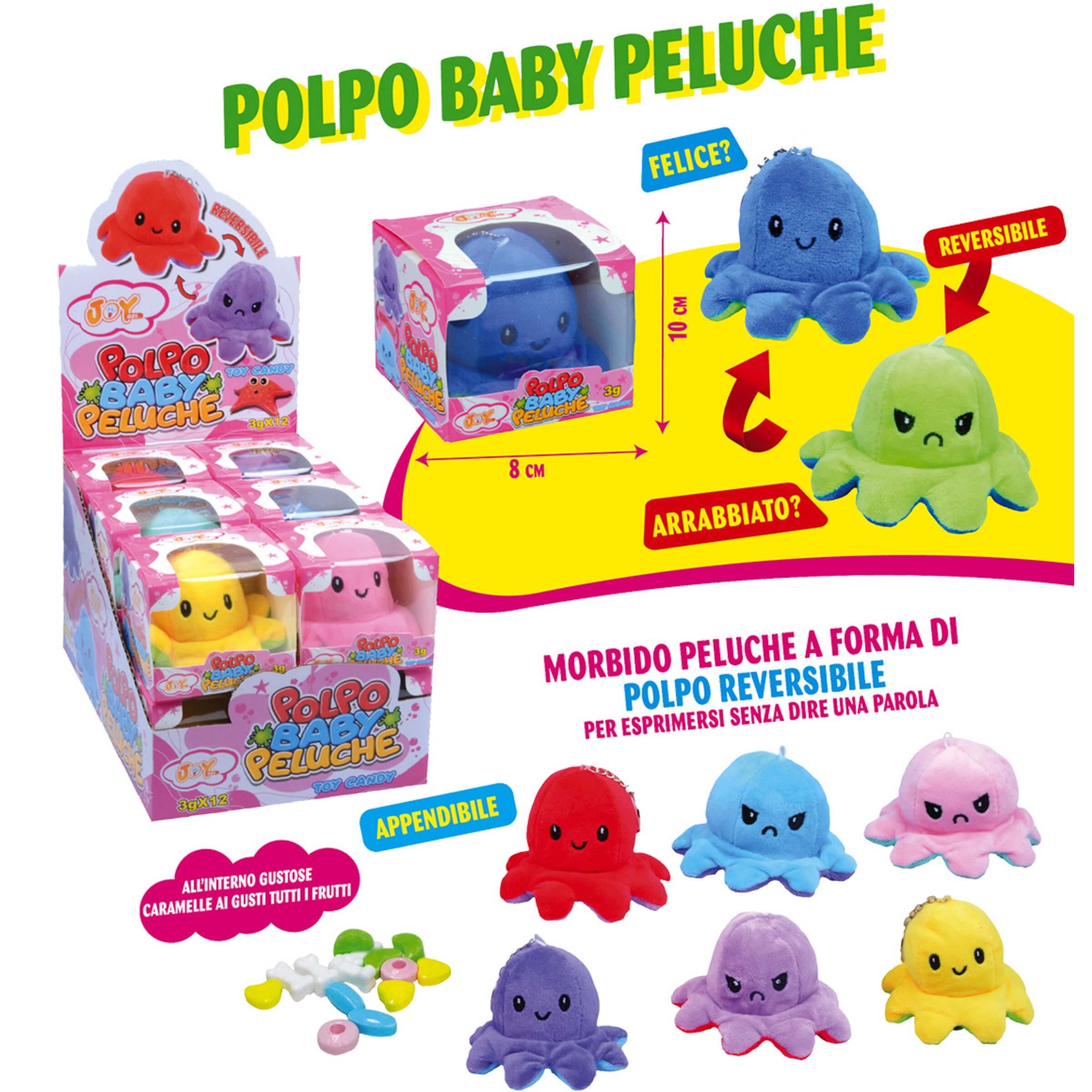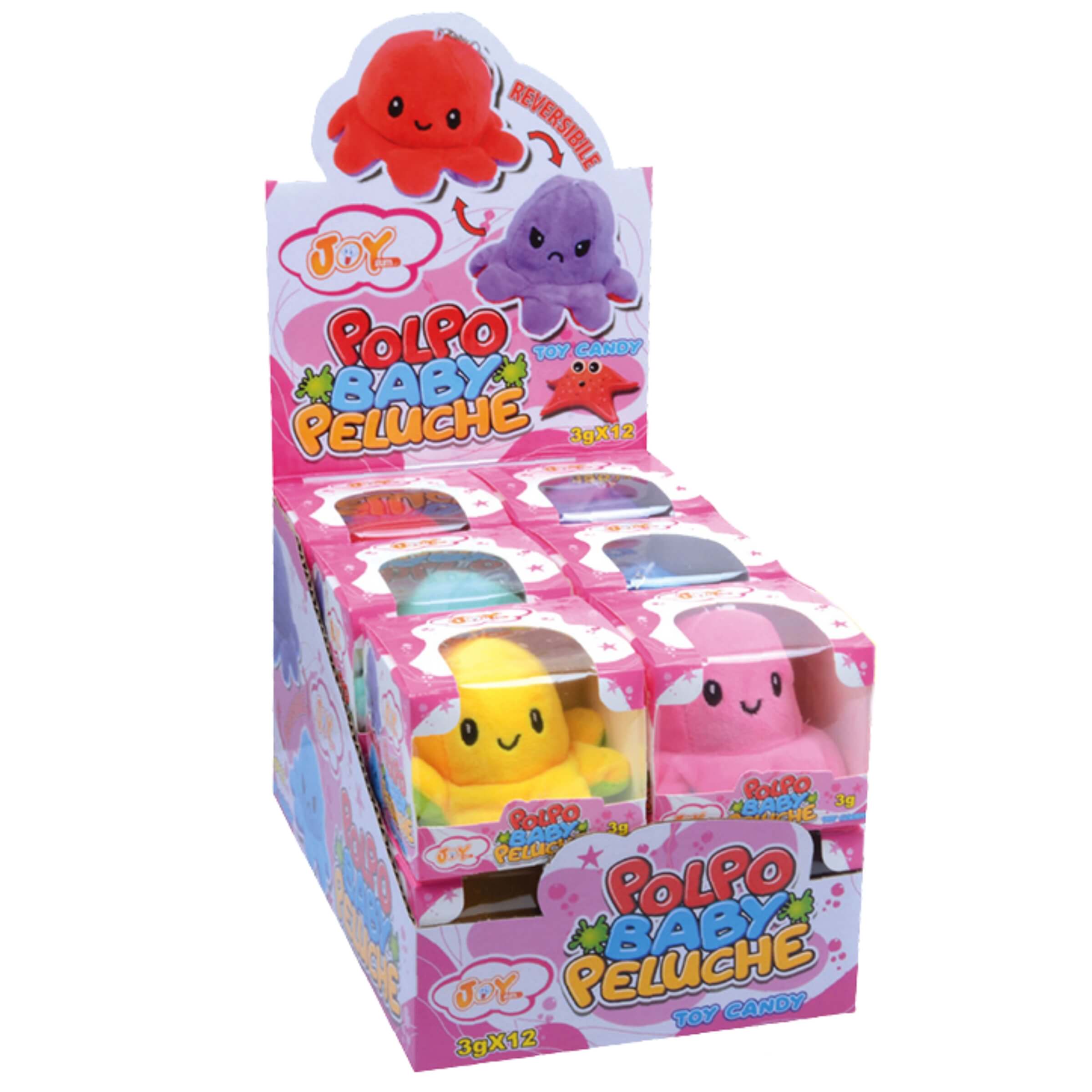 Quando le emozioni si trasformano in gioco, nascono prodotti capaci di comunicare senza bisogno di parole. Il polpo baby peluche reversibile di Joygum è pensato per esprimere in modo immediato e divertente ciò che si prova: basta un gesto per passare da un volto felice a uno arrabbiato. Realizzato in morbido tessuto, colorato e soffice al tatto, questo piccolo polipo peluche nasconde al suo interno una dolce sorpresa. Ogni confezione include infatti una selezione di caramelle al gusto tutti i frutti, per unire l’affetto di un peluche al piacere di una pausa golosa. Il formato appendibile lo rende perfetto da portare ovunque: sullo zaino, in macchina o come decorazione.• Peluche reversibile: Il polpo in morbido peluche cambia espressione ruotandolo su sé stesso, passando da felice ad arrabbiato in un secondo, per permettere ai bambini di giocare con le emozioni.• Formato compatto: Ogni polpo misura circa 10 centimetri in altezza e 8 centimetri in larghezza, dimensioni ideali per una presa facile e una portabilità adatta anche ai più piccoli.• Peso netto 3 grammi: All’interno di ogni confezione sono presenti caramelle incartate al gusto tutti i frutti, in quantità corrispondente a un peso netto di 3 grammi.• Espositore da 24 pezzi: Il display da banco è composto da 24 peluche confezionati singolarmente in scatola, perfettamente visibili grazie al packaging trasparente e colorato.• Colori assortiti e appendibile: Ogni polpo è disponibile in vari colori vivaci e dotato di anellino per essere appeso, rendendolo un accessorio decorativo oltre che un gioco.Il polpo baby peluche reversibile è più di un giocattolo: è uno strumento emotivo, un compagno morbido e una sorpresa dolce. Perfetto per regalare sorrisi e tenerezza in ogni occasione, diventa un articolo ideale per negozi, cartolerie, edicole e spazi dedicati all’infanzia. Un oggetto capace di comunicare affetto e creatività, sempre pronto a cambiare umore con un gesto.