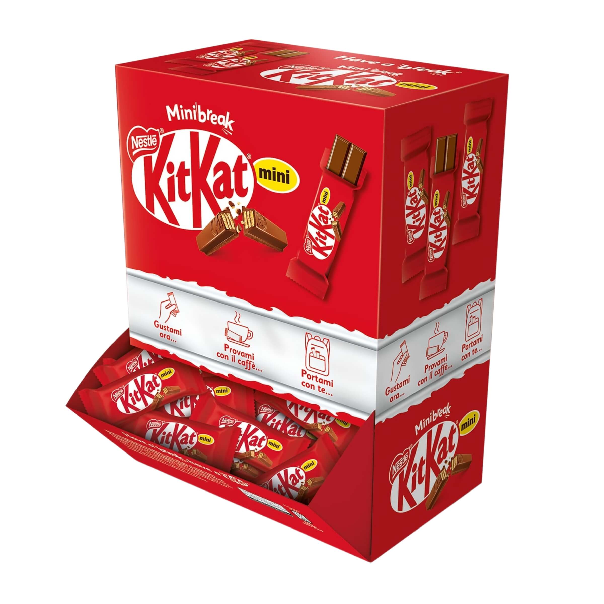 Una pausa croccante e leggera in formato mini, perfetta per ogni momento della giornata. L’espositore Kit Kat Mini Nestlé da 1,3 kg racchiude 70 barrette confezionate singolarmente, pronte per essere gustate ovunque: in ufficio, al bar, a casa o durante una breve pausa di relax. Il formato in marsupio unisce praticità e visibilità, diventando un’ottima soluzione da banco per punti vendita che desiderano offrire uno snack iconico, facile da distribuire e sempre apprezzato. Il connubio tra cioccolato al latte e wafer croccante rappresenta da sempre un equilibrio perfetto tra golosità e leggerezza, con un sapore che mette d’accordo grandi e piccoli.• Croccantezza in formato mini: Ogni barretta Kit Kat Mini è realizzata con strati sottili di wafer croccante avvolti da morbido cioccolato al latte, in una porzione bilanciata e appagante.• Formato multiporzione da 70 pezzi: Il marsupio contiene 70 snack monodose, ideali per la vendita al dettaglio, il consumo individuale o la condivisione in spazi di lavoro, eventi e occasioni conviviali.• Confezionamento singolo: Le barrette sono incartate una a una, garantendo igiene, praticità e freschezza in ogni assaggio, perfette per il consumo fuori casa.• Display marsupio da banco: La confezione in cartone autoportante facilita l’esposizione e il prelievo, valorizzando il prodotto e ottimizzando lo spazio nei punti vendita.• Riconoscibilità del brand: Kit Kat è tra gli snack più noti e amati a livello globale, sinonimo di qualità e piacere immediato, con un’immagine forte che attira l’attenzione e aumenta la rotazione del prodotto.Il Kit Kat Mini in esposizione da banco è molto più di uno snack: è un invito a concedersi un piccolo momento di piacere quotidiano, senza esagerare. Il suo formato compatto, la bontà consolidata nel tempo e la praticità d’uso lo rendono una scelta vincente per chi vuole arricchire l’offerta dolciaria con un prodotto versatile, iconico e sempre gradito.
