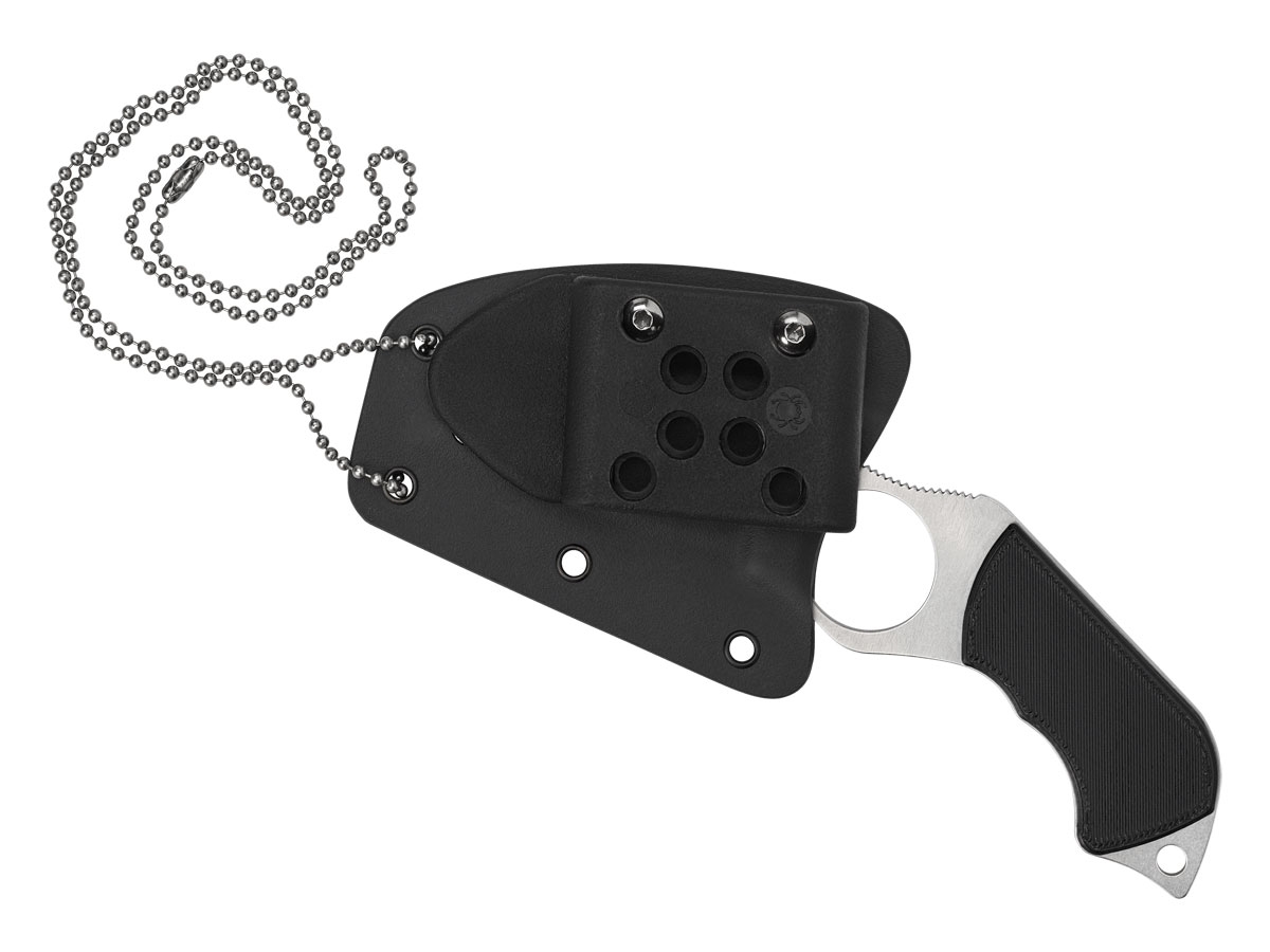 Di dimensioni adatte alla mano di un uomo, il foro da 0,91 pollici di diametro (23,1 mm) è affiancato da una lama Wharncliffe completamente piatta e da un'impugnatura a pistola con codolo intero. Perni interni nascosti fissano un paio di guancette con texture peel-ply all'impugnatura e una sezione di zigrinatura (scanalature testurizzate) posizionata strategicamente sul dorso fornisce una rampa antiscivolo per il pollice. Realizzato in LC200N ultraresistente alla corrosione, lo Swick è dotato di una guaina Boltaron stampata su misura con G-Clip completamente regolabile e catena a sfere di sicurezza per offrire una gamma completa di opzioni di trasporto.