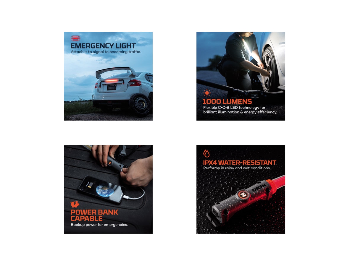 - Ricaricabile USB-C- 6 Modalità di luce- Power Bank- Striscia luminosa rotante 120°- Funzione Direct-to-Red- Potente alloggiamento magnetico- Resistente all'acqua (IPX4) e agli urti- Power Memory Recall - Smart Power Control