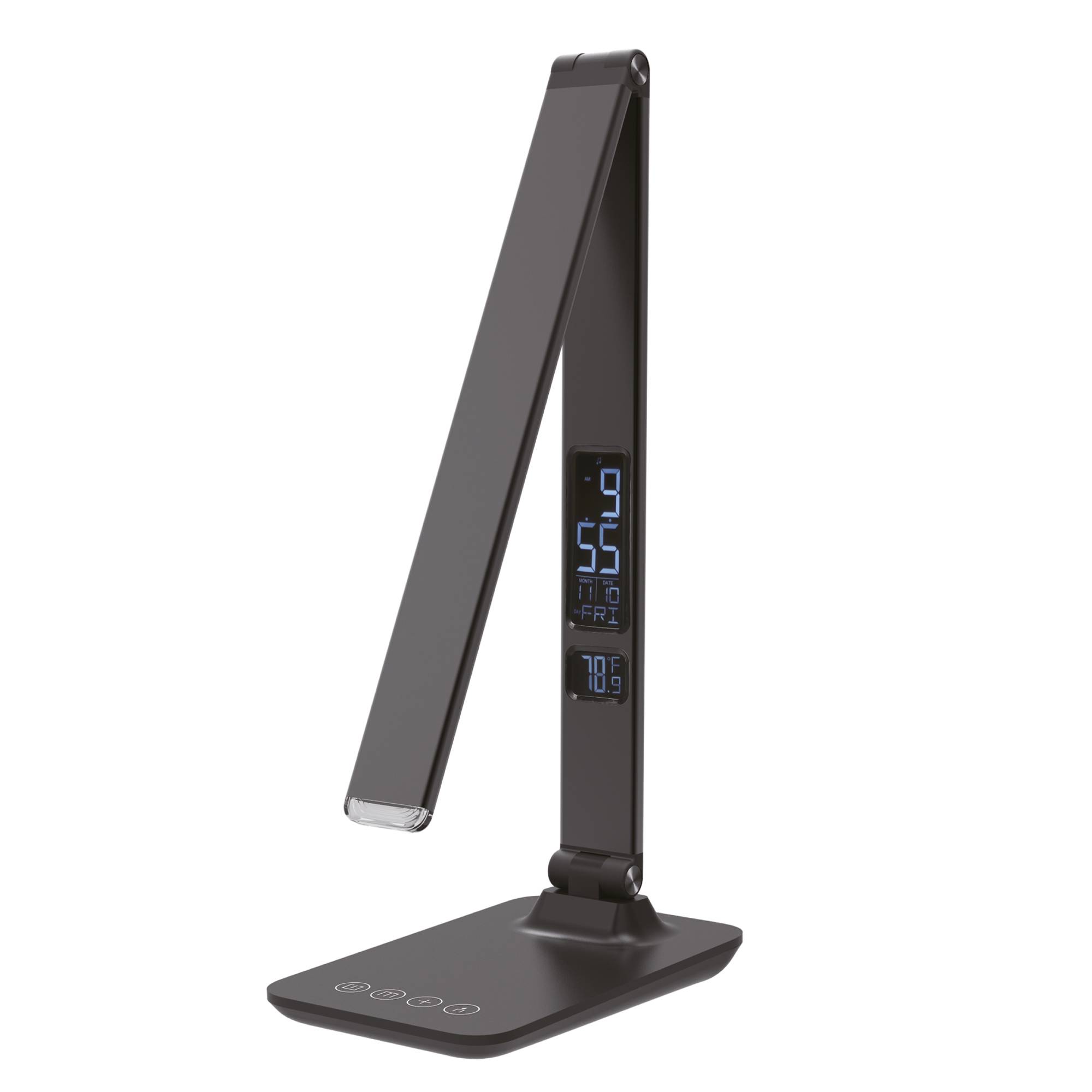 Lampada LED 10W Grigio antracite Viva Alba LAMPADA A LED INTEGRATO 10W CON TESTA E BRACCIO INCLINABILI IN ALLUMINIO E ABS. PORTA USB PER RICARICARE I TUOI SUPPORTI. DISPLAY LCD CON FUNZIONE CALENDARIO E TERMOMETRO. INTENSITA' DELLA LUCE IN 3 COLORI BIANCO, GIALLO E NATURALE. INTERRUTTORE ON/OFF POSIZIONATO SUL RETRO DELLA LAMPADA.