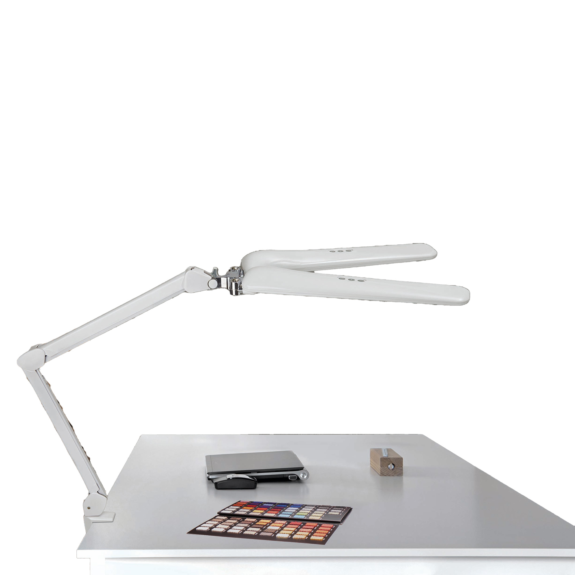 LAMPADA A LED CON DUE TESTE DI LAMPADA E MORSETTO DA TAVOLO. BIANCO CON SUPERFICIE LUCIDA E' DOTATA DI DUE TESTE DI LAMPADA, CHE INSIEME PRODUCONO UN ELEVATO ILLUMINAMENTO. IL PRATICO MORSETTO DA TAVOLO CONSENTE DI FISSARE MAULCRAFT DUO A TAVOLI E SCAFFALI.