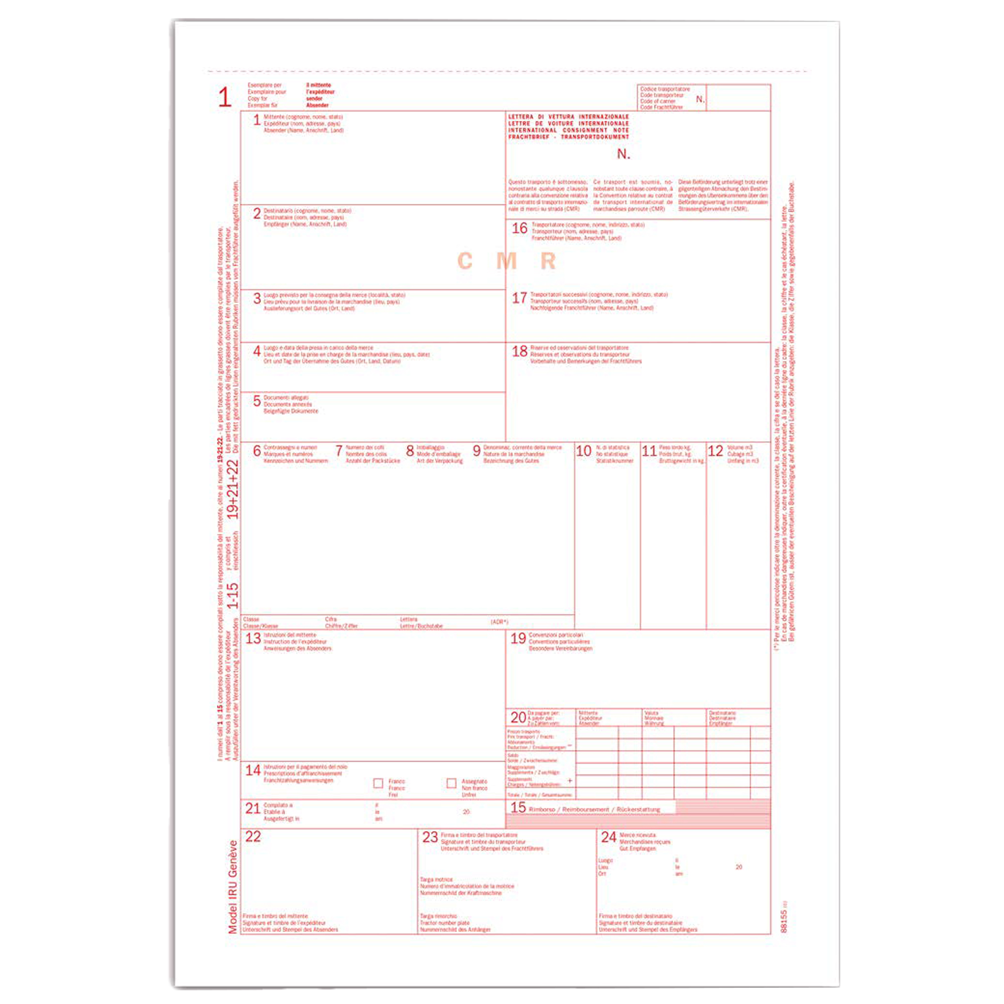 Lettera di vettura internazionale CMR snap 5copie autor.31x21cm Data Ufficio