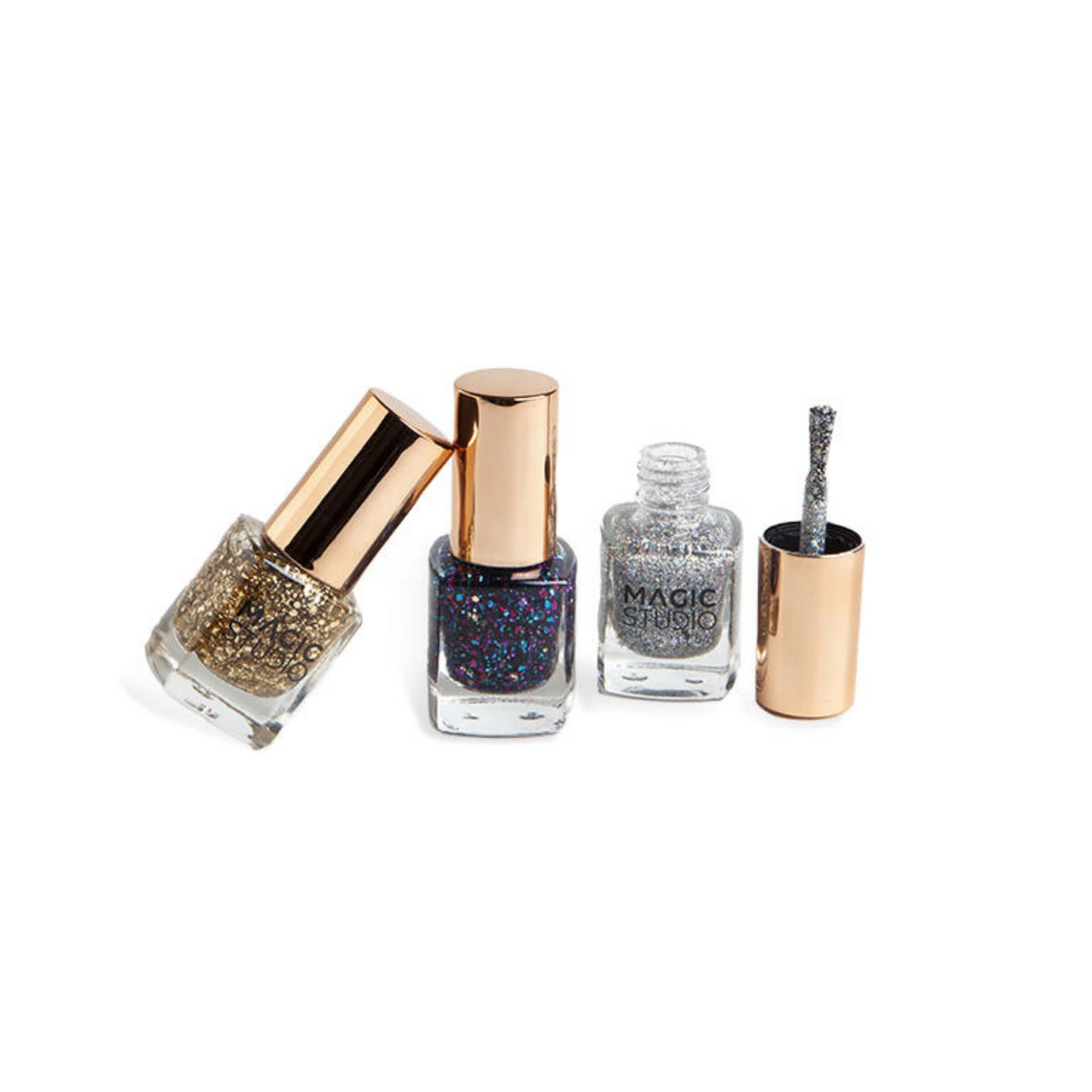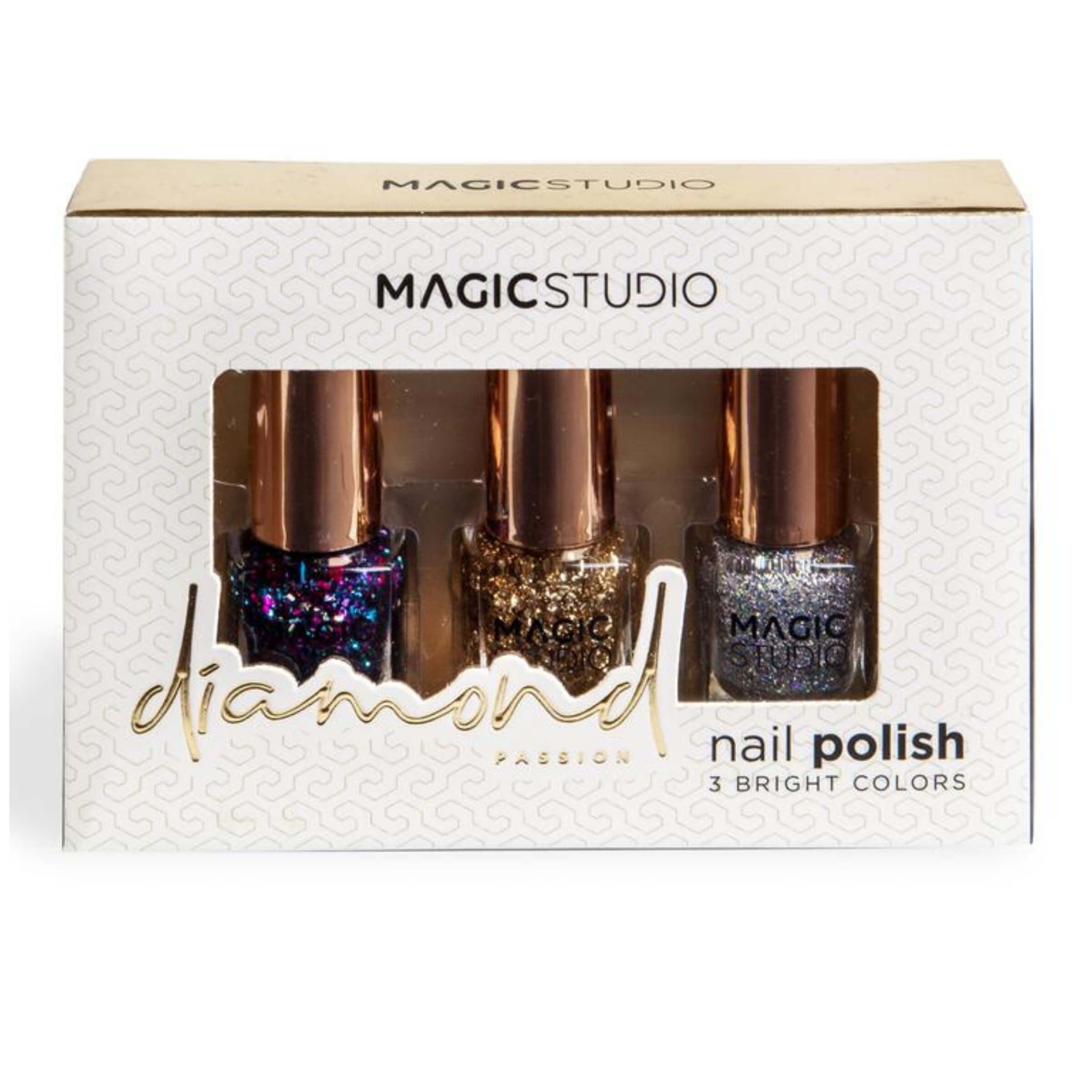 Il set Magic Studio Diamond è una collezione di tre smalti brillanti che trasformano la manicure in un accessorio di stile unico e luminoso. Perfetti per chi ama un look elegante ma allo stesso tempo vivace, questi smalti glitterati offrono colori intensi e riflessi luminosi che catturano la luce a ogni movimento. Le tonalità oro, argento e viola con glitter multicolor permettono di sperimentare combinazioni diverse, adatte sia a un’occasione speciale sia per valorizzare la quotidianità con un tocco di glamour. La texture dei prodotti è pensata per garantire una stesura semplice e uniforme, mentre il pennellino consente di applicare lo smalto con precisione, creando un effetto professionale direttamente a casa.• Tonalità brillanti: Il set comprende tre colori intensi e luminosi - oro, argento e viola glitter - ideali per creare manicure personalizzate e sempre diverse.• Effetto glitter: Le particelle luminose donano un effetto scintillante e multidimensionale, perfetto per rendere le unghie protagoniste di ogni look.• Applicazione facile: Il pennellino studiato per una stesura uniforme consente un’applicazione precisa anche a chi non ha molta esperienza.• Formula resistente: La consistenza è pensata per ridurre le sbeccature e mantenere più a lungo la brillantezza dello smalto, garantendo una manicure curata per giorni.• Versatilità d’uso: Può essere utilizzato da solo per un effetto deciso o come top coat sopra altri colori per aggiungere luminosità e profondità.• Idea regalo: La confezione elegante rende questo set un’ottima scelta come dono per chi ama la cura delle unghie e i dettagli di bellezza scintillanti.Questo set di smalti Magic Studio rappresenta un accessorio immancabile per chi vuole dare un carattere unico e brillante al proprio stile. Ogni tonalità esalta le mani con giochi di luce che aggiungono fascino e personalità, rendendo la manicure un dettaglio capace di completare qualsiasi outfit.