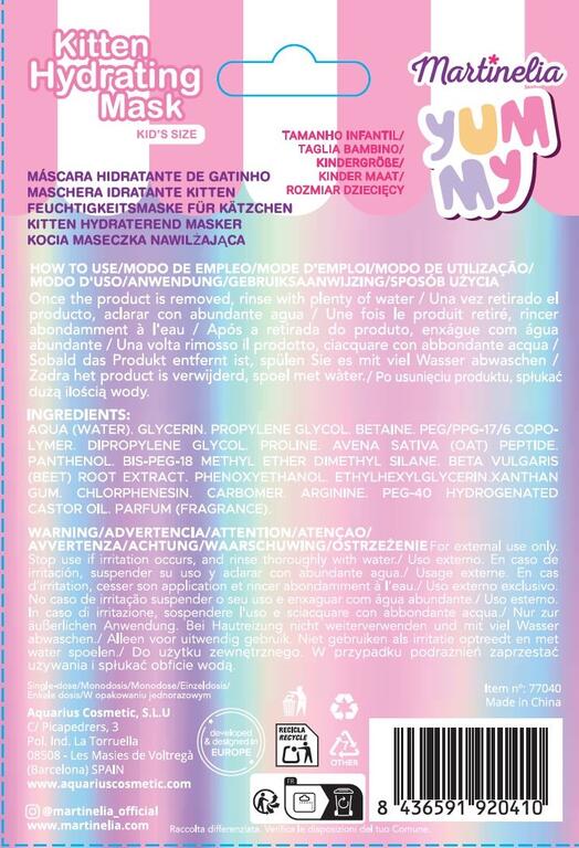 La maschera viso Martinelia Yummy Kitten è un trattamento idratante pensato appositamente per i più piccoli, trasformando la skincare in un momento divertente e colorato. Con il suo design a forma di gattino e la formulazione delicata, questa maschera monodose da 23 g è adatta ai bambini dagli 8 ai 12 anni, rendendo la cura della pelle un’esperienza piacevole e sicura. Il tessuto sagomato aderisce comodamente al viso e rilascia un siero idratante arricchito con ingredienti selezionati che aiutano a mantenere la pelle morbida e fresca, rispettando la sensibilità cutanea dei più giovani.• Idratazione delicata: La maschera è studiata per nutrire la pelle dei bambini, fornendo un’idratazione equilibrata senza appesantire, ideale per contrastare la secchezza.• Formula arricchita: Contiene ingredienti come glicerina, betaina e pantenolo che aiutano a proteggere la pelle, donando una sensazione di comfort e freschezza prolungata.• Estratti naturali: La presenza di avena e barbabietola contribuisce ad ammorbidire la pelle, migliorandone l’elasticità e proteggendola dalle aggressioni esterne.• Tessuto sagomato: La maschera si adatta perfettamente al viso dei bambini, rendendo l’applicazione semplice e piacevole, con un effetto divertente grazie al design a faccia da gatto.• Esperienza ludica: Oltre al beneficio cosmetico, il simpatico design trasforma il trattamento in un gioco, rendendo la skincare più accattivante e coinvolgente.• Monodose pratica: Confezione singola da 23 g, già pronta all’uso, perfetta per un trattamento rapido a casa e semplice da utilizzare anche senza esperienza.Questa maschera rappresenta una soluzione ideale per avvicinare i più piccoli alla cura della pelle in modo divertente e sicuro. Idrata, protegge e regala un momento di leggerezza, unendo i benefici cosmetici a un’esperienza simpatica e colorata che conquisterà bambini e genitori.