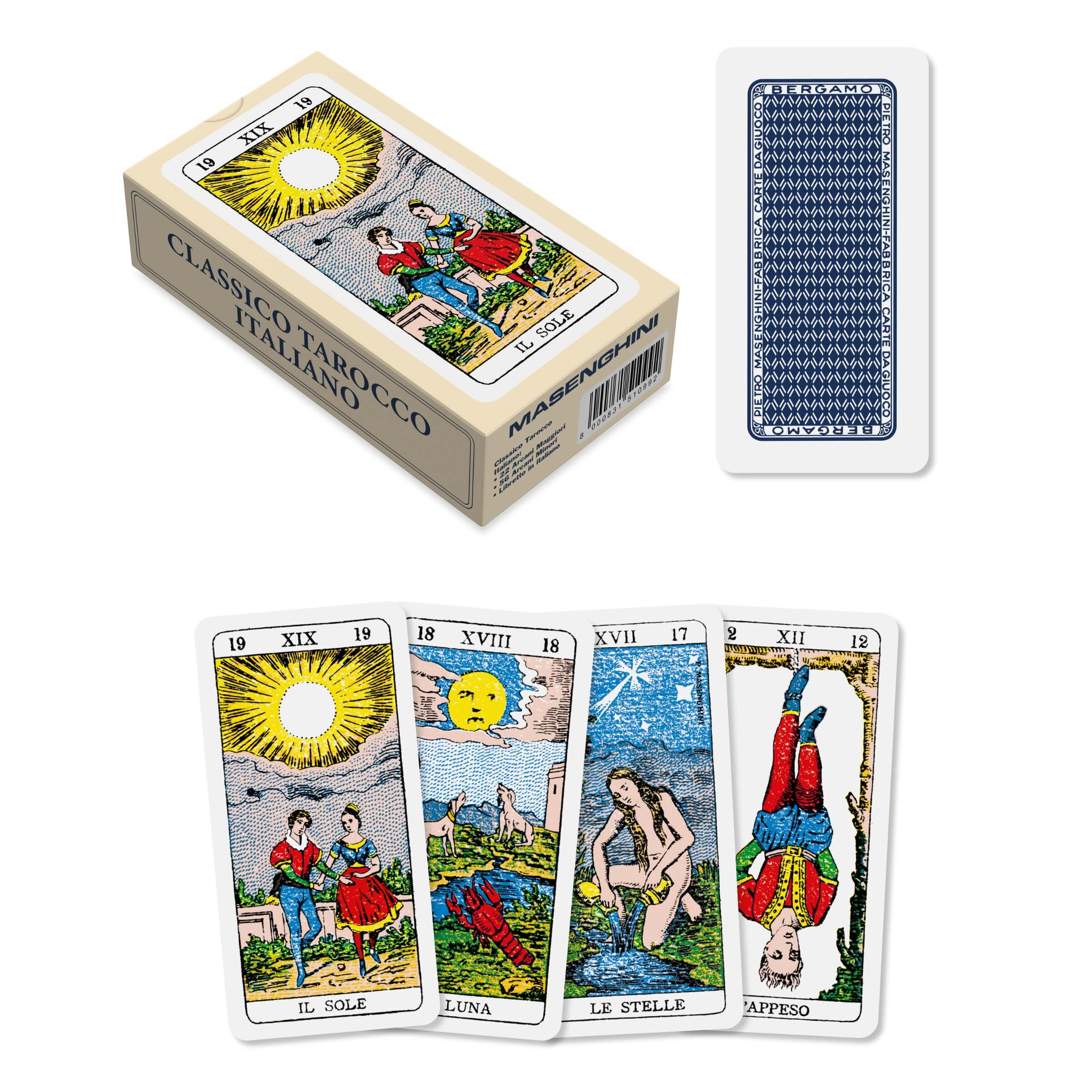 Scopri la tradizione e l'eleganza con il Classico Tarocco Italiano di Masenghini, un mazzo che rappresenta la quintessenza della cartomanzia e della cultura italiana. Questo set di tarocchi, composto da 78 carte, offre un ponte tra l'arte divinatoria tradizionale e la raffinatezza estetica, rendendolo un must-have per collezionisti e praticanti.• Heritage Italiano Autentico: Prodotto da Masenghini, noto fabbricante di carte da gioco, questo mazzo rispecchia la lunga tradizione italiana nella creazione di tarocchi, unendo qualità artigianale e profondità simbolica.• Completamente Illustrato: Il mazzo include i 22 Arcani Maggiori e i 56 Arcani Minori, ciascuna carta splendidamente illustrata, permettendo letture divinatorie ricche e dettagliate.• Formato Maneggevole: Con dimensioni di 54x108 mm, le carte offrono una maneggevolezza eccellente, facilitando l'uso sia per i neofiti che per i tarocchisti esperti.• Libretto Incluso: Accompagnato da un libretto in italiano, il set fornisce istruzioni dettagliate sull'interpretazione delle carte e suggerimenti per diverse disposizioni, rendendo la pratica divinatoria accessibile a tutti.• Confezione Completa: Oltre alle 78 carte, il mazzo viene fornito in una scatola che ne facilita la conservazione e il trasporto, assicurando che le tue carte rimangano in perfetto stato.Il Classico Tarocco Italiano Masenghini è una celebrazione della cultura e dell'arte divinatoria italiana, offrendo non solo uno strumento per la riflessione e la guida spirituale ma anche un'opera d'arte da ammirare. Che tu sia un appassionato di tarocchi alla ricerca di un mazzo con radici profonde nella tradizione, o un principiante curioso di esplorare l'arte della cartomanzia, questo set è la scelta ideale per immergersi nel mondo affascinante dei tarocchi con stile e autenticità.