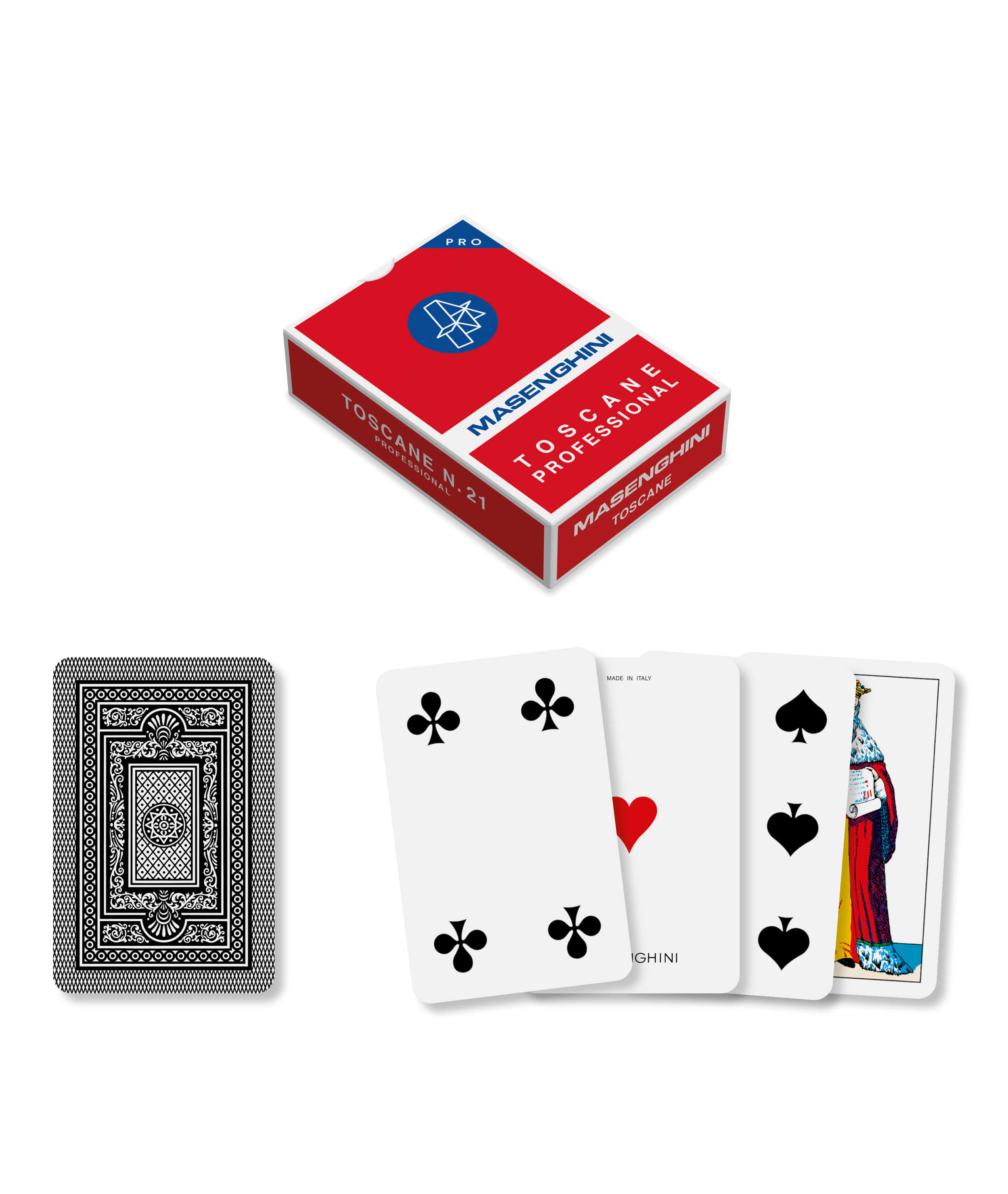 Le carte da gioco regionali Toscane Masenghini Professional sono realizzate interamente in PVC per garantire massima durata, flessibilità e resistenza all’usura. Questo mazzo rappresenta la tradizione toscana in una versione professionale, ideale per lunghe partite e utilizzi intensivi.Il formato da 58x88 mm è quello tipico delle Toscane, apprezzate per la loro grafica semplice e intuitiva. Ogni mazzo è custodito in un astuccio rosso che ne assicura protezione e praticità.• Tradizione toscana: Carte regionali con semi francesi (cuori, quadri, fiori e picche), tipiche della Toscana.• Materiale professionale: Realizzate in PVC 100% per garantire lunga durata, impermeabilità e resistenza.• Formato regionale: Dimensioni 58x88 mm, standard delle carte Toscane.• Mazzo da 40 carte: Perfetto per i giochi classici della tradizione toscana.• Astuccio rosso: Confezione resistente e compatta che protegge le carte nel tempo.Le Carte Masenghini Toscane Professional uniscono tradizione e qualità moderna, offrendo un mazzo pratico e duraturo per ogni occasione di gioco.
