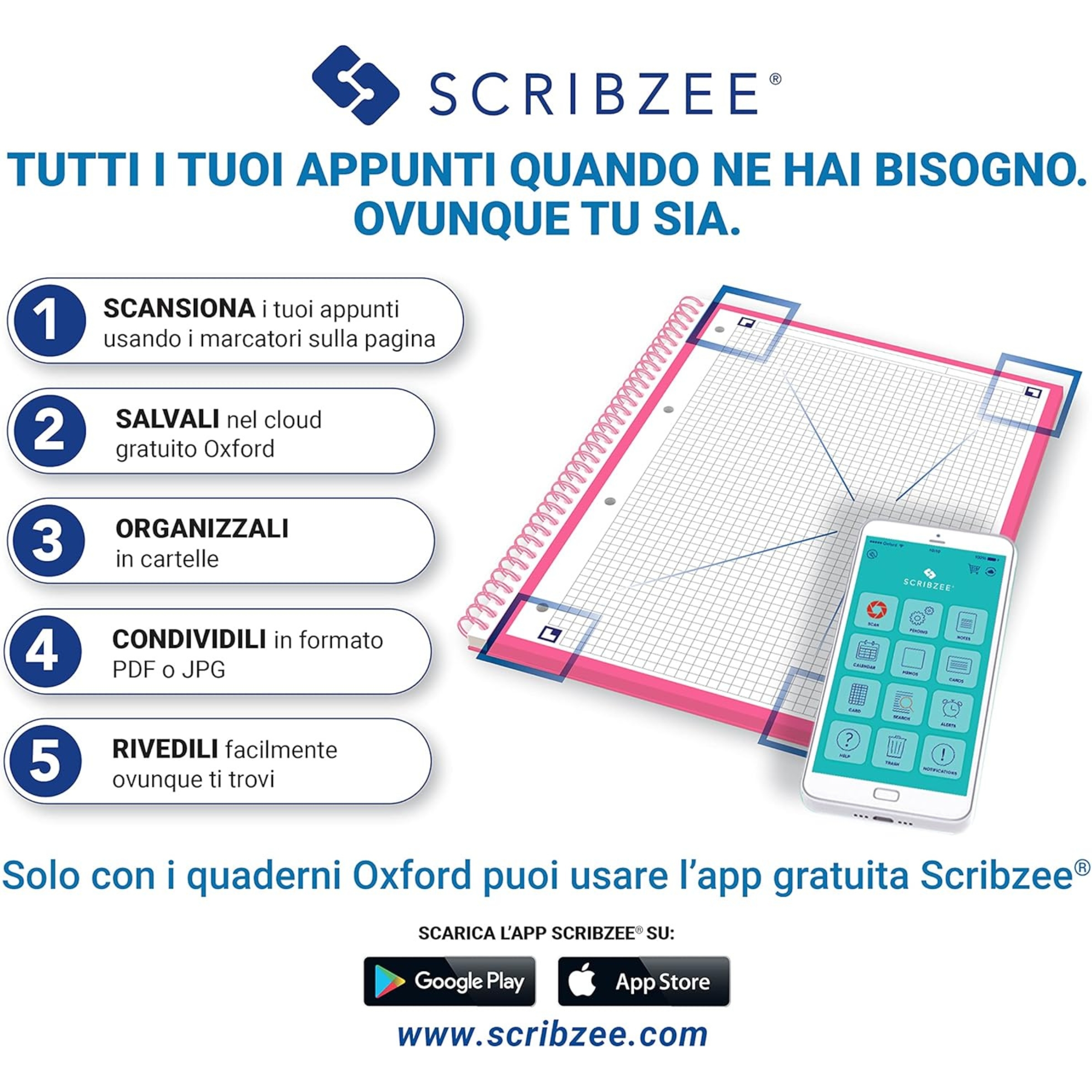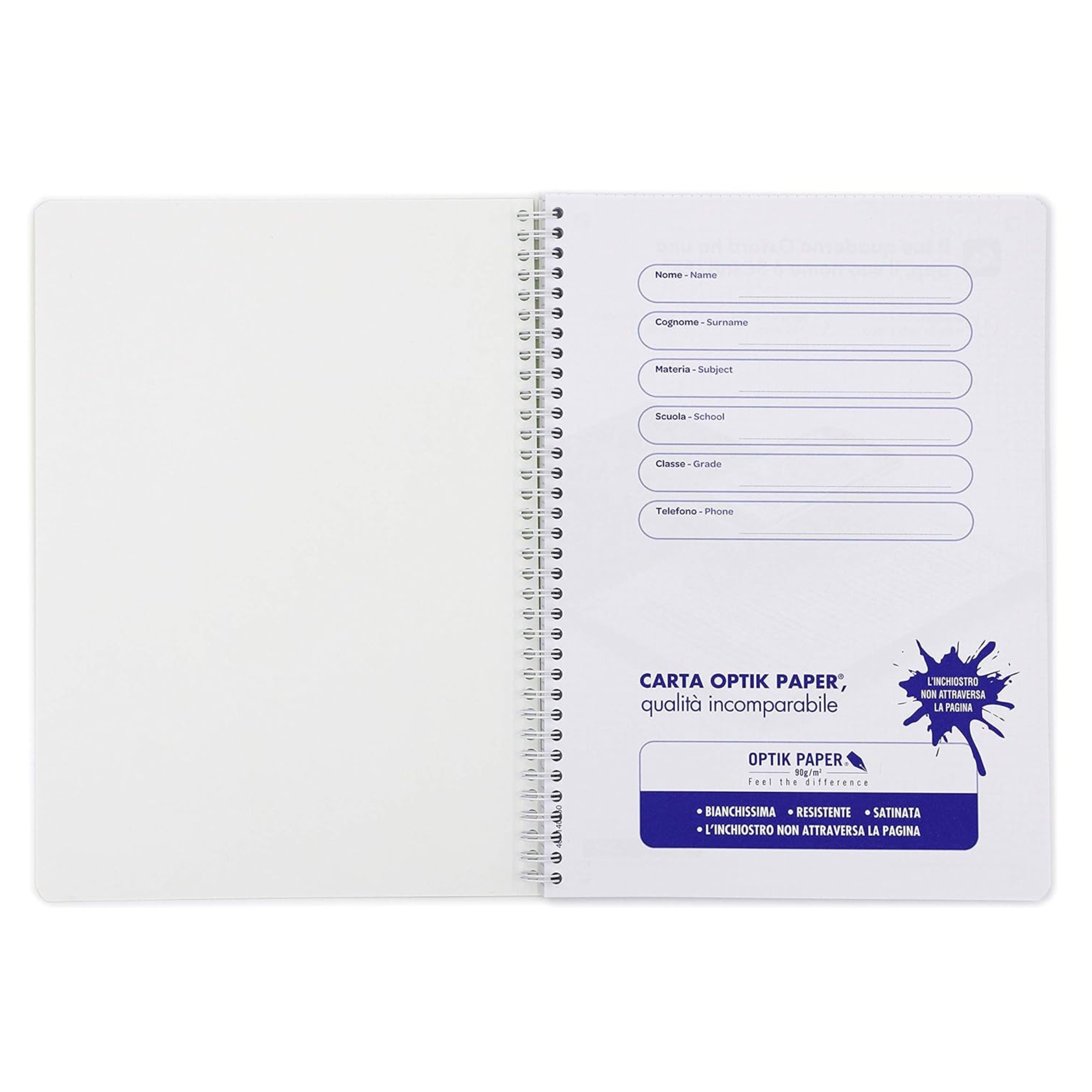 Maxiquaderno Spiralato A4+ 1 rigo 120fg 90g colori ass. Neon On OXFORD MAXI SPIRALATO A4+ CON COPERTINA IN CARTONCINO FLESSIBILE IN 5 COLORI FLUO: FUCSIA, VERDE, ARANCIO, GIALLO E AZZURRO. SPIRALE DI COLORE BIANCO. 120 PAGINE CON MICROPERFORAZIONE E 4 FORI, RIGATURA 4MM, 5MM E 1R. CARTA OPTIK PAPER DA 90 G., BIANCHISSIMA, LISCIA, SATINATA E RESISTENTE AGLI STRAPPI L'INCHIOSTRO NON ATTRAVERSA LA PAGINA. SPECIALI MARCATORI AGLI ANGOLI DELLE PAGINE DA UTILIZZARE CON L'APP SCRIBZEE . Composto da 5
