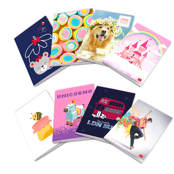 MAXIQUADERNO RILEGATO CON PUNTO METALLICO. COPERTINA IN CARTONCINO DA 205GR VERNICIATURA UV. RISGUARDO PERSONALIZZABILE STAMPATO FRONTE E RETRO. FANTASIE ASSORTITE 2023. Composto da 10