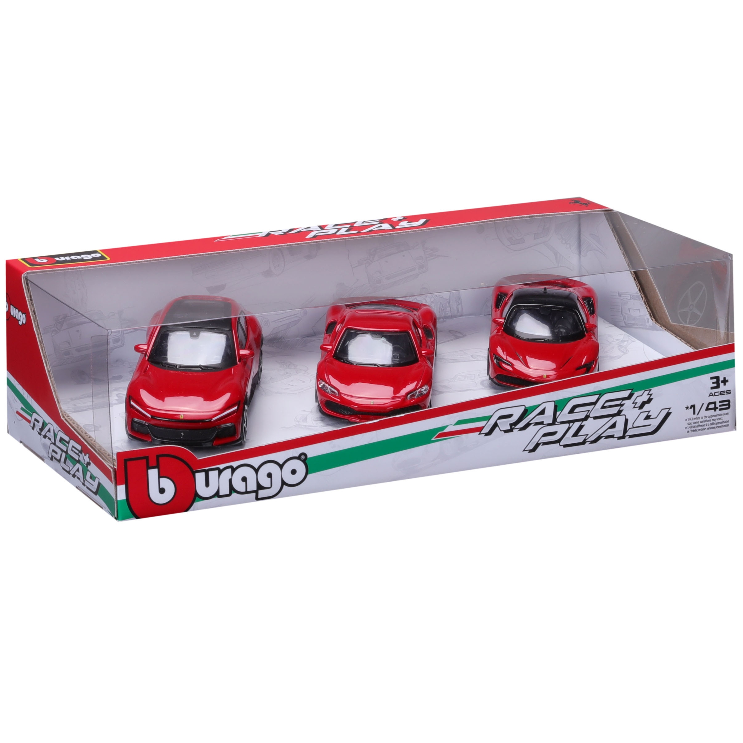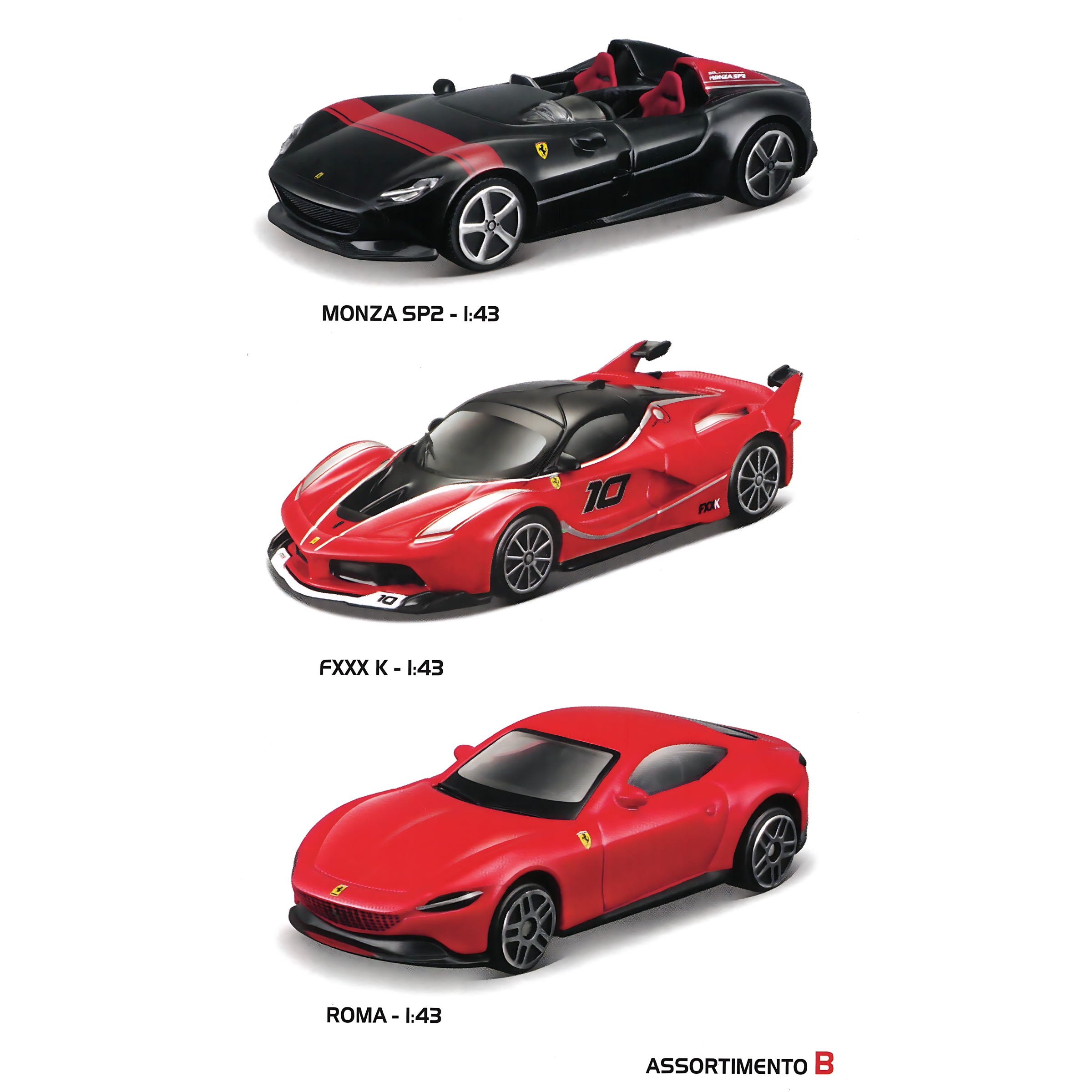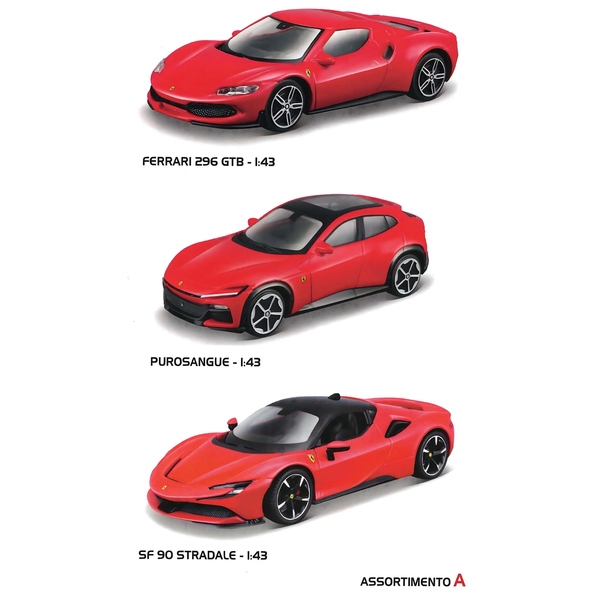 Il Gift Pack Ferrari 3 Modellini Auto Die Cast 1:43 è una selezione straordinaria di auto Ferrari in scala 1:43, perfetta per collezionisti e appassionati. Questa confezione regalo offre una varietà di modelli accuratamente riprodotti con dettagli eccezionali.• Dettagli Realistici: Ogni modellino è caratterizzato da una riproduzione fedele dei dettagli delle vetture Ferrari originali. Dai loghi agli elementi del design, ogni aspetto è curato per offrire un prodotto autentico e visivamente accattivante.• Materiale Die Cast di Alta Qualità: Realizzati in materiale Die Cast resistente, questi modellini garantiscono robustezza e durabilità nel tempo, rendendoli perfetti sia per l'esposizione che per il gioco.• Scala: La scala 1:43 consente di apprezzare ogni minimo dettaglio in una dimensione compatta e pratica, ideale per collezionisti che desiderano una collezione di alta qualità con un ingombro ridotto.• Design Iconico: I modellini catturano l'essenza delle vetture originali, con linee eleganti e colorazioni vivaci che rendono ogni pezzo un elemento distintivo nella tua collezione.• Ampia Selezione: Questo gift pack include 2 differenti assortimenti:Assortimento A:Ferrari 296 GTBPurosangueSF 90 StradaleAssortimento B:Monza SP2FXXX KRoma• Perfetto per Collezionisti: Questo gift pack è un'aggiunta eccellente per qualsiasi collezione di auto in scala, offrendo una selezione di modelli Ferrari che rappresentano l'eccellenza automobilistica italiana.Il Gift Pack Ferrari 3 Modellini Auto Die Cast 1:43 è il regalo perfetto per gli appassionati di Ferrari, combinando estetica e qualità in un'unica confezione. Ideale per chi desidera portare a casa un pezzo della leggenda Ferrari.