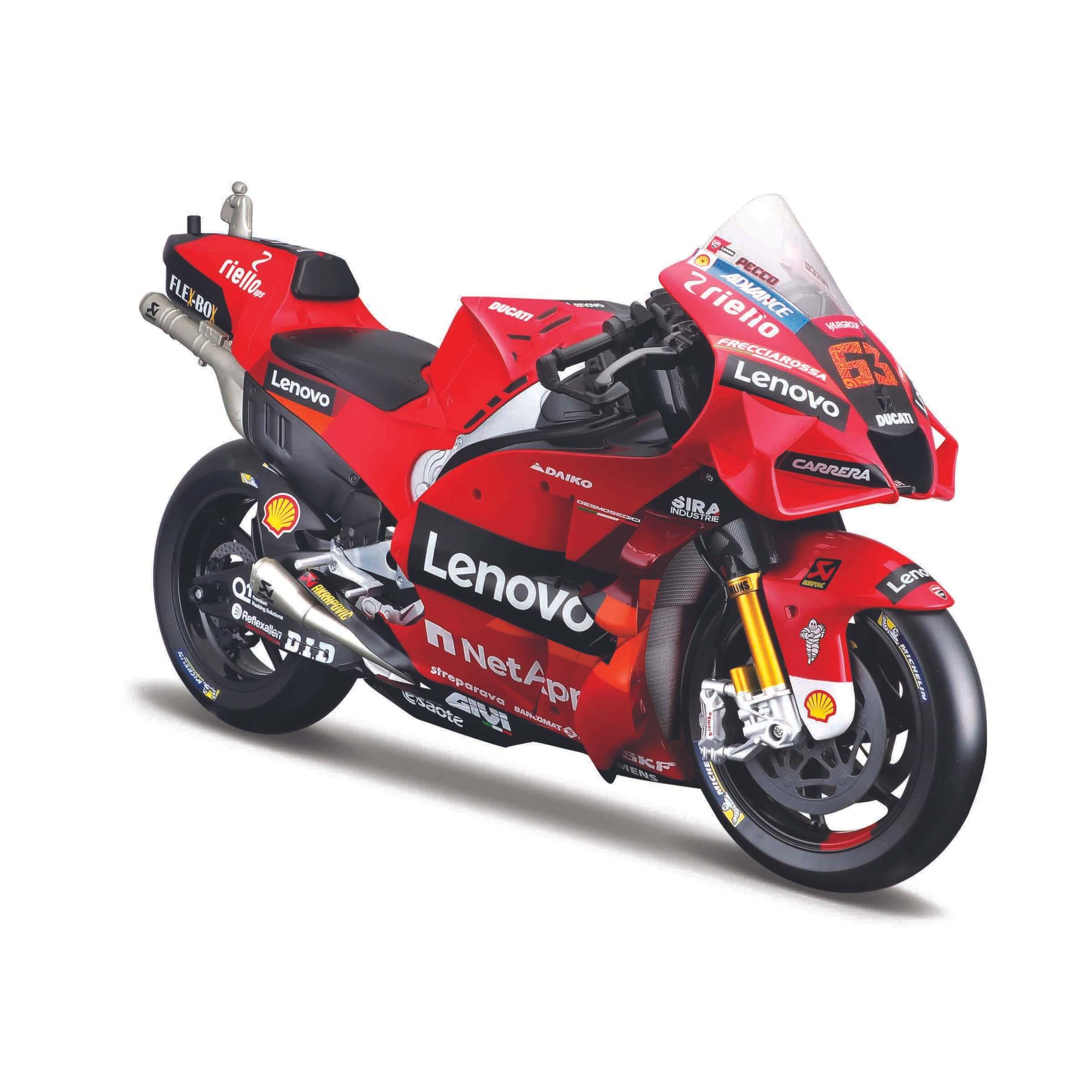 Questo modellino Die Cast rappresenta fedelmente la Ducati Desmosedici del Team Lenovo, pilotata dal campione del mondo 2022 Francesco Bagnaia. Perfetto per gli appassionati di motociclismo e collezionisti, il modellino in scala 1:6 è un pezzo imperdibile che cattura ogni dettaglio della moto da corsa.• Design Dettagliato: Realizzato con grande attenzione ai dettagli, questo modellino riproduce fedelmente la Ducati Desmosedici del Team Lenovo, dal numero 63 di Bagnaia alle grafiche degli sponsor.• Materiali di Alta Qualità: Costruito in metallo pressofuso (die cast) con parti in plastica, il modellino offre durabilità e un aspetto realistico, perfetto per l'esposizione.• Scala: La scala 1:6 rende questo modellino particolarmente imponente e dettagliato, ideale per essere aggiunto a qualsiasi collezione di modellini di motociclette.• Ideale per Collezionisti: Questo modellino è un'ottima scelta per i collezionisti e gli appassionati di motociclismo, offrendo un pezzo commemorativo della vittoria di Bagnaia nel campionato mondiale 2022.• Confezione Originale: Il modellino è confezionato nella sua scatola originale, che lo protegge durante il trasporto e ne aumenta il valore collezionistico.Aggiungi alla tua collezione un pezzo di storia del motociclismo con il modellino Die Cast della Ducati Desmosedici Team Lenovo di Francesco Bagnaia, celebrando il trionfo del campione del mondo 2022.