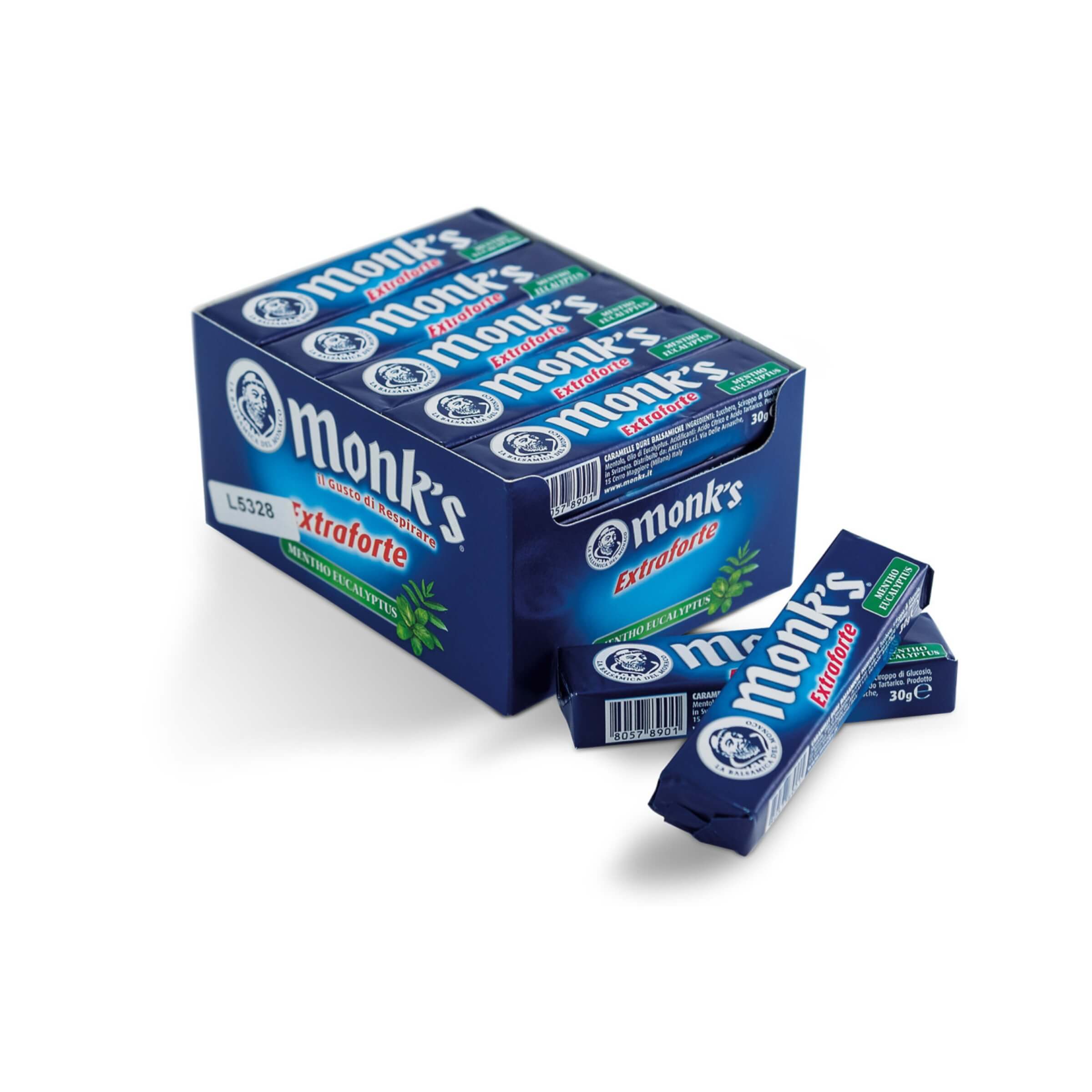 • Gusto Potente: Le caramelle Monk's Extraforte Mentho Eucalyptus offrono una combinazione di menta ed eucalipto extra forte che rinfresca intensamente il palato e favorisce la respirazione.