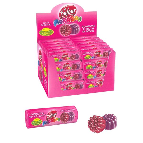 Una dolce esplosione di gusto, senza zucchero. Le gommose Morabon ai Frutti di Bosco firmate Dufour uniscono la bontà della frutta a una formula più leggera grazie alla presenza dell’estratto di Stevia, dolcificante naturale. Ogni stick racchiude un assortimento di caramelle gommose a forma di mora e lampone, dal gusto intenso e dalla consistenza irresistibile. Perfette per chi cerca uno snack gustoso ma attento alla linea.