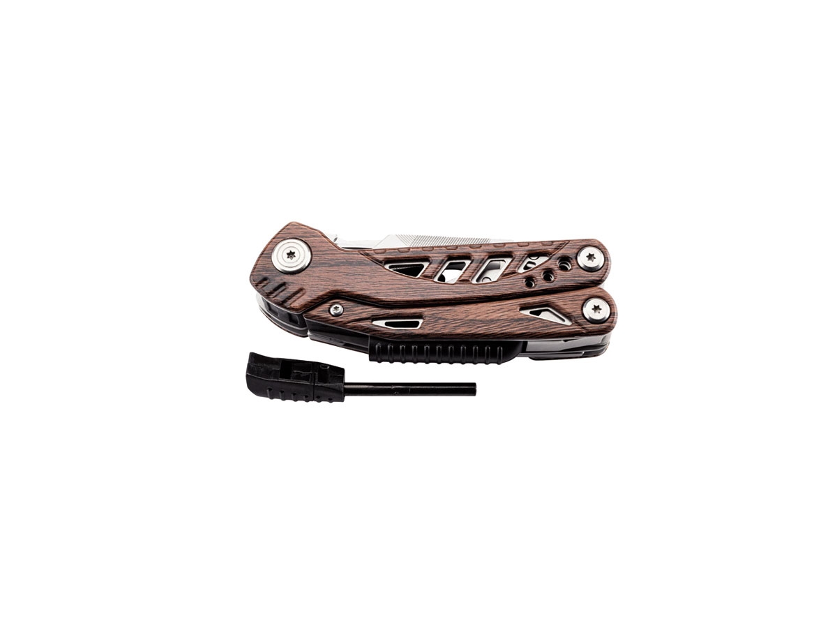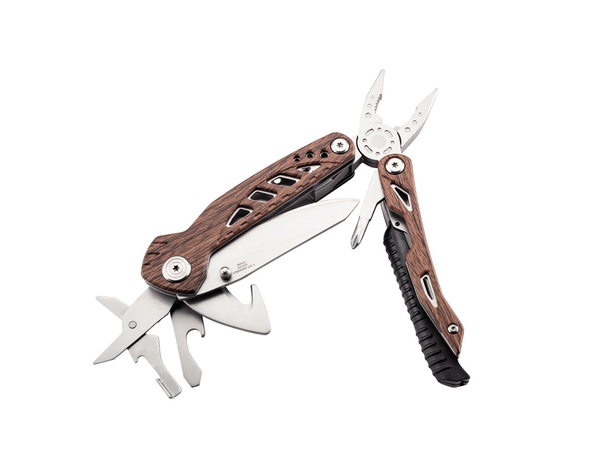 Questo multiutensile in legno di Herbertz colpisce per le sue pratiche funzioni. Gli strumenti includono: pinza a becchi mezzotondi caricati a molla con tagliacavi, coltello a una mano con liner lock, moschettone, forbici, apribottiglie con cacciavite a taglio, lima, cacciavite Philips e acciarino accendifuoco. La fornitura include una custodia in nylon nero con passante per cintura.