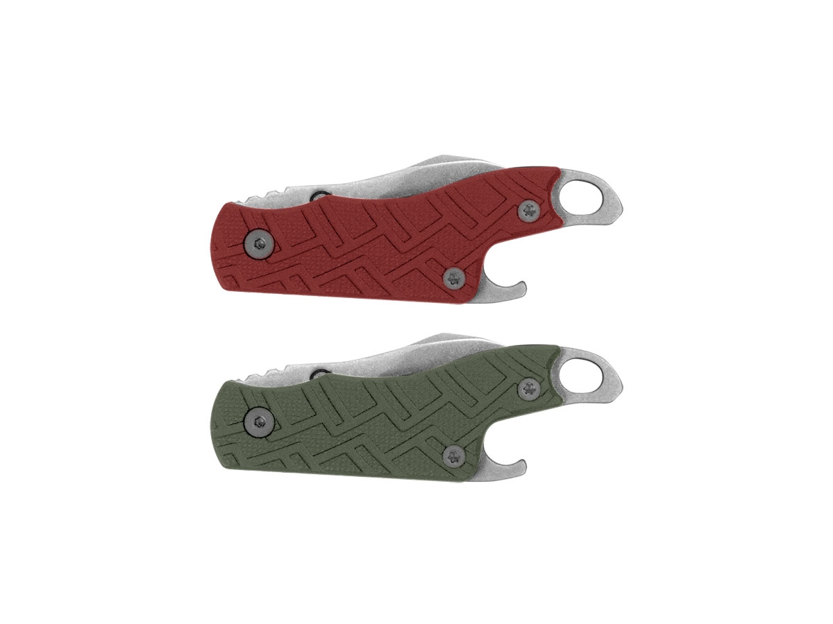 Progettato dal coltellinaio Rick Hinderer, il Cinder è un ottimo cutter ed pratico mini coltello. Ha un sacco di stile e potenza di taglio, ma in una dimensione "portachiavi", in modo da poterlo portare quasi ovunque. La robusta e pratica impugnatura in nylon è resistente e di facile manutenzione. Il manico include un apribottiglie ed un anello portachiavi. Nella confezione sono presenti due pezzi: uno con il manico rosso ed uno con il manico vered oliva.