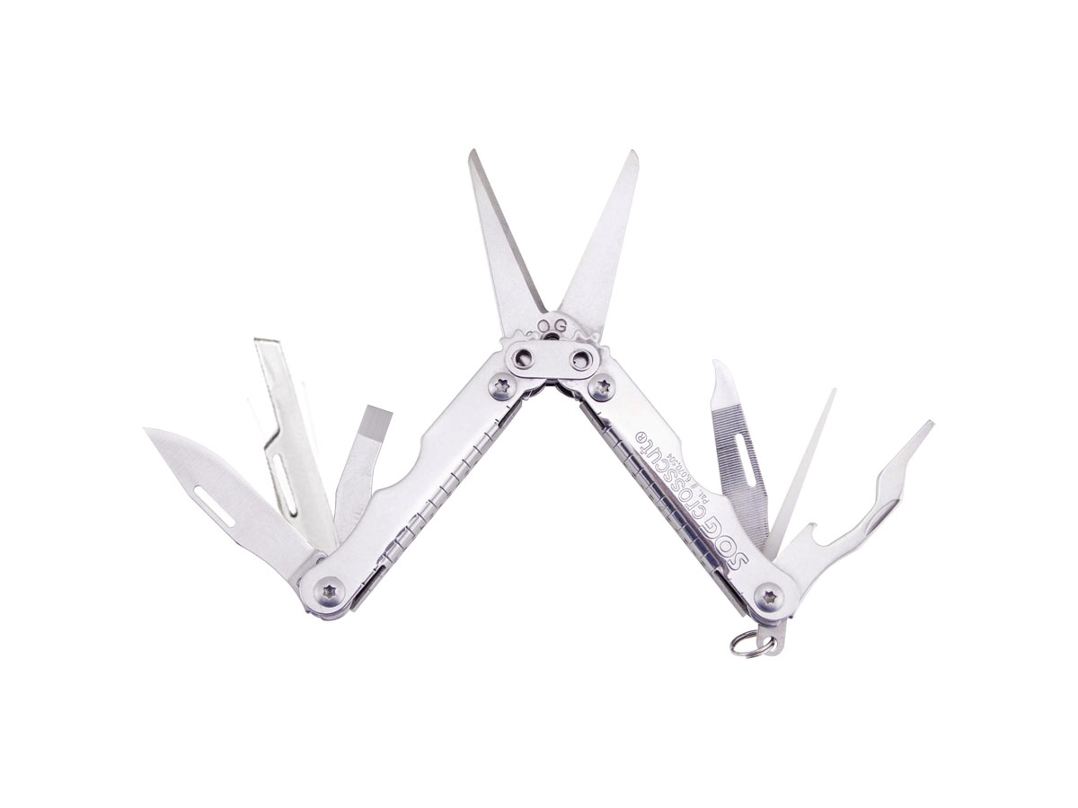 Il CrossCut è uno strumento di precisione per il taglio, la presa, la cura personale e l'imprevisto. La leva composta da ingranaggi di SOG (Compound Leverage )consente di miniaturizzare veramente la potenza di taglio di grandi dimensioni.