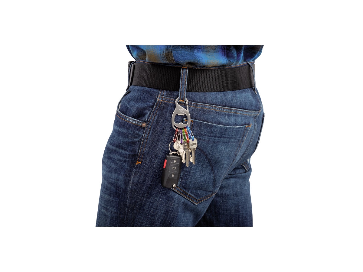 Questo moschettone in acciaio inossidabile è abbinato a sei mini S-Biner in plastica colorata per attaccare, rimuovere e identificare facilmente le chiavi. Si agganciano le singole chiavi agli S-Biner, quindi si collega l'intero KeyRack+ al passante della cintura o al cinturino della borsa utilizzando il corpo del moschettone. Inoltre, questo KeyRack+ include un comodo apribottiglie integrato nel corpo in acciaio.