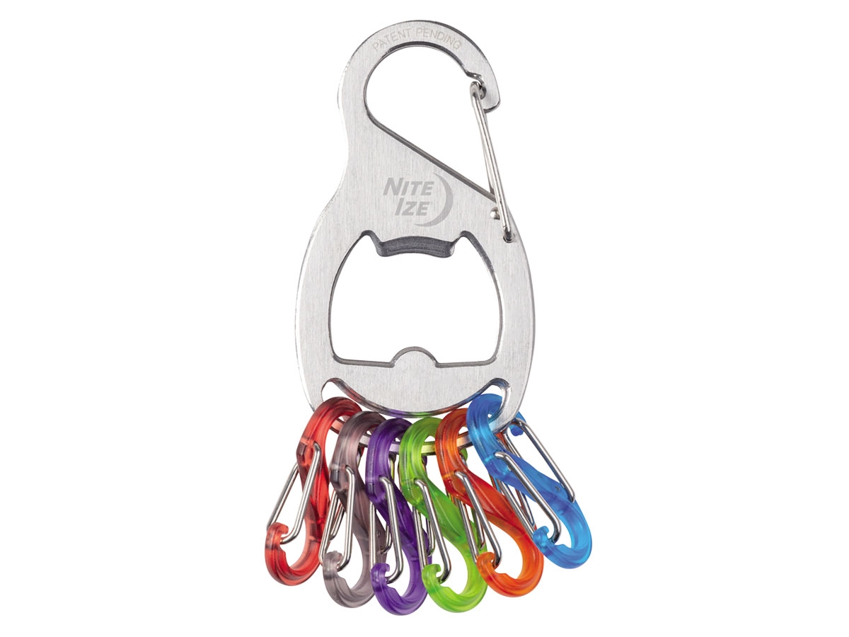 Questo moschettone in acciaio inossidabile è abbinato a sei mini S-Biner in plastica colorata per attaccare, rimuovere e identificare facilmente le chiavi. Si agganciano le singole chiavi agli S-Biner, quindi si collega l'intero KeyRack+ al passante della cintura o al cinturino della borsa utilizzando il corpo del moschettone. Inoltre, questo KeyRack+ include un comodo apribottiglie integrato nel corpo in acciaio.