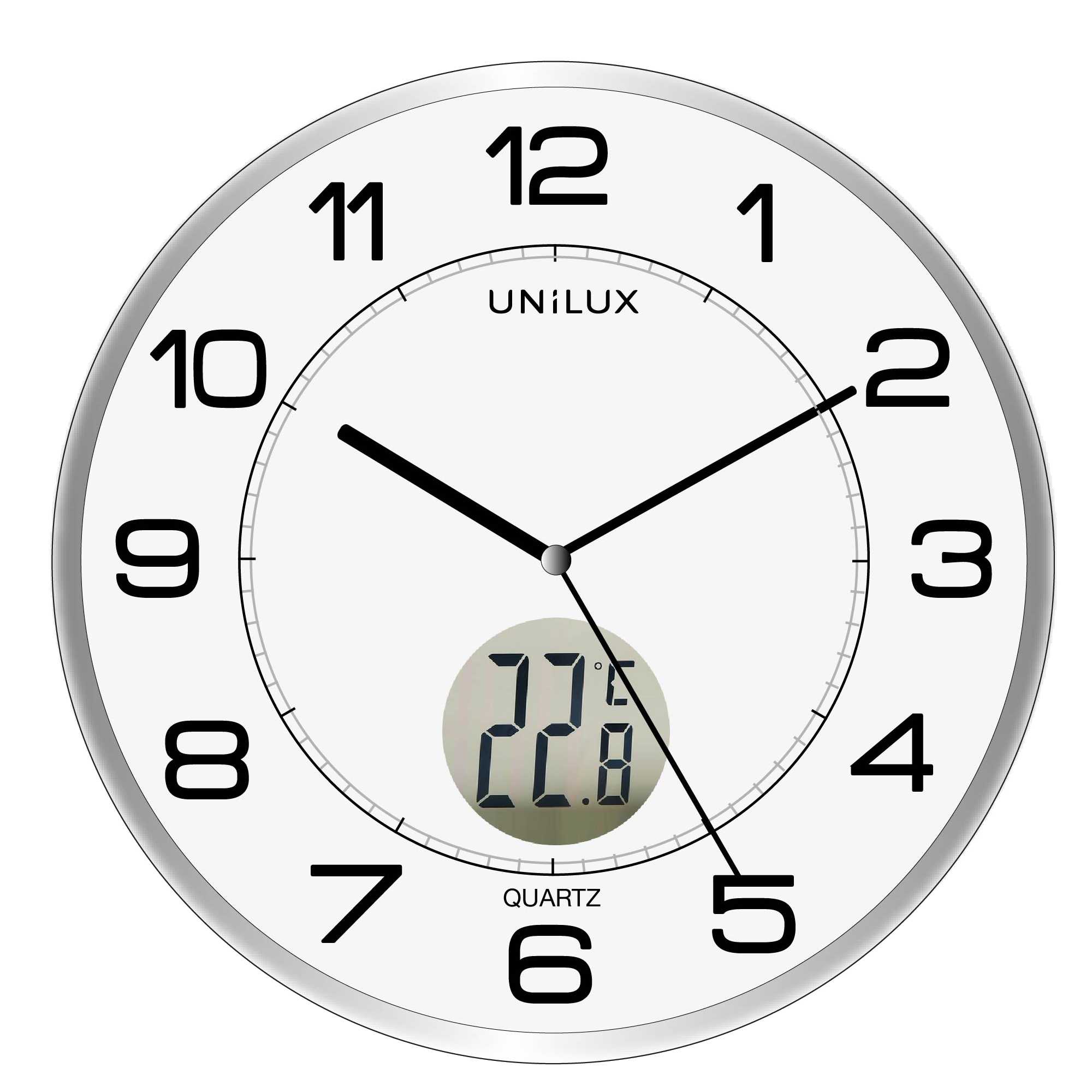 OROLOGIO DA PARETE SOBRIO E MODERNO. DOTATO DI TERMOMETRO DIGITALE CHE SEGNALA SU UN DISPLAY LCD LA TEMPERATURA AMBIENTE. STRUTTURA IN PLASTICA CON PROTEZIONE IN VETRO. ALIMENTAZIONE: 1 BATTERIA AA 1,5V (INCLUSA).
