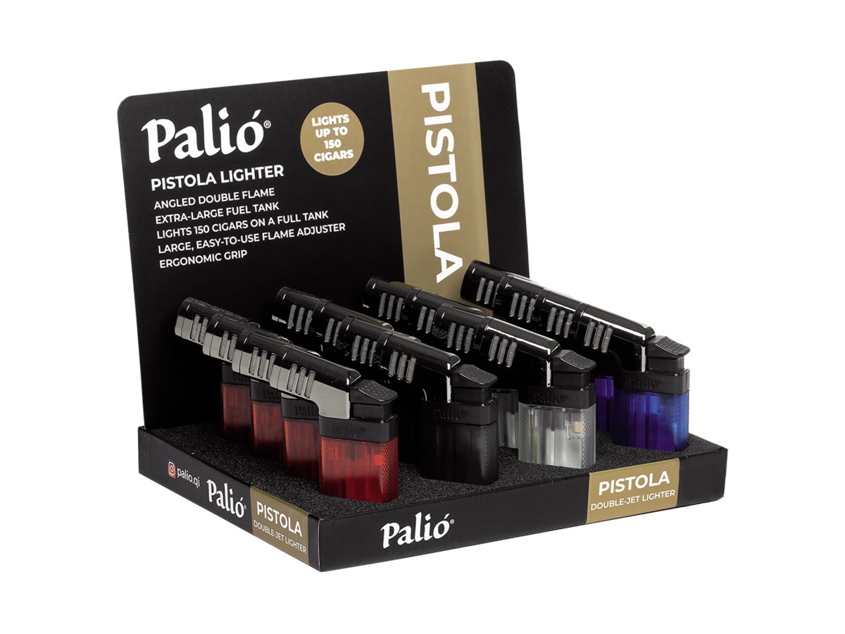L'accendino Palió Pistola è dotato di una potente fiamma angolata a doppio getto. Il suo corpo si adatta perfettamente alla mano ed è abbinato ad un ampio grilletto per comfort e controllo. E' dotato di un grande serbatoio traslucido con capacità sufficiente per accendere fino a 150 sigari tra un rifornimento e l'altro. La grande rotella di regolazione della fiamma, facile da usare, è un'ulteriore caratteristica ergonomica che consente all'utente di trovare senza sforzo l'altezza della fiamma desiderata. E' testato in alta quota fino a 12.000 piedi (3,658 m).