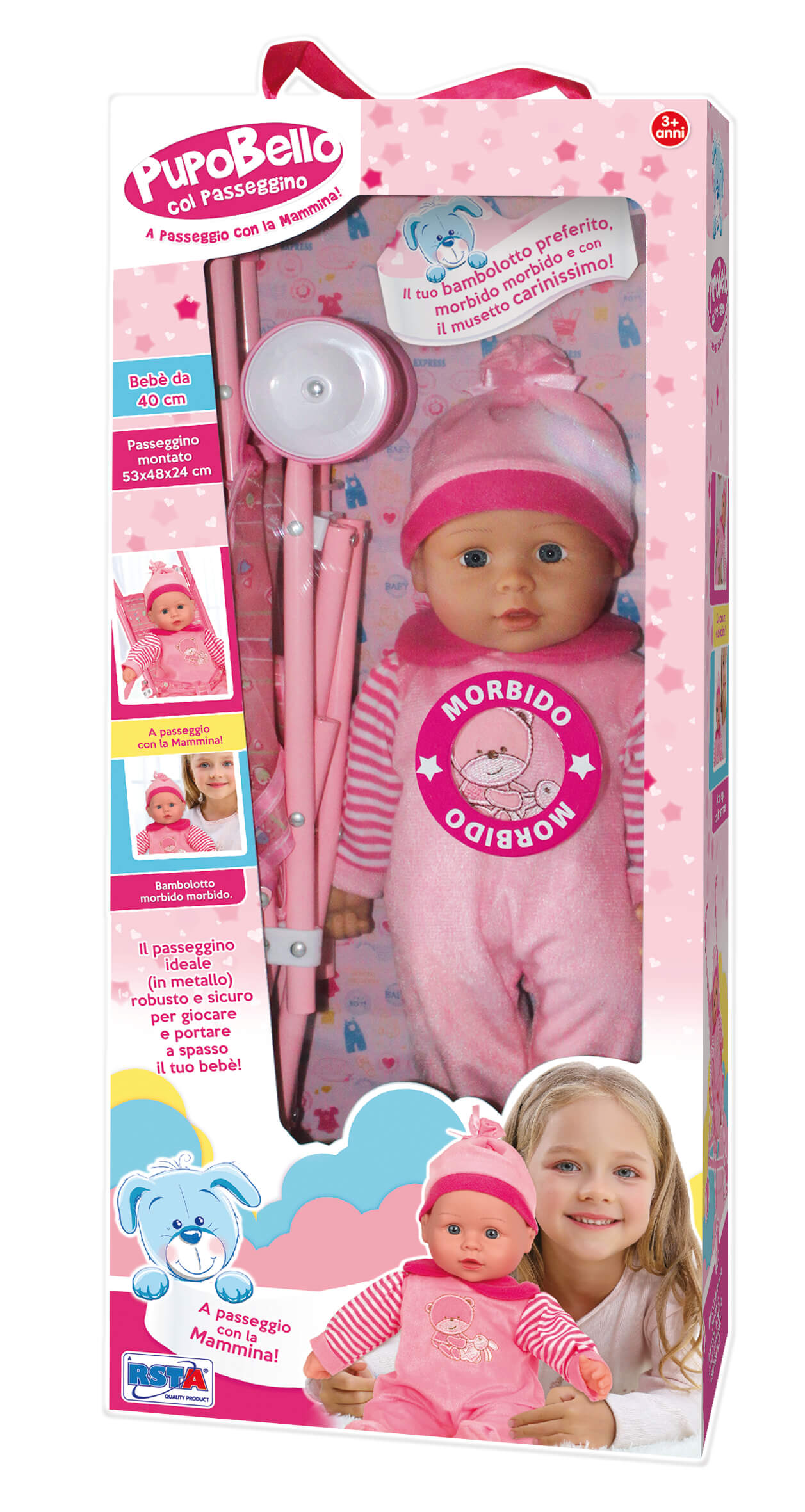 Pupo Bello col Passeggino - Il Compagno PerfettoPorta a casa il tuo nuovo amico, il Pupo Bello, e inizia a vivere avventure incredibili! Con un bebè da 40 cm e un passeggino montato delle dimensioni di 53x48x24 cm, avrai tutto il necessario per passeggiate e giochi indimenticabili.Caratteristiche Principali:• Bambolotto Morbido: Il tuo bambolotto preferito è incredibilmente morbido e dotato di un viso bellissimo. Sarà un compagno dolce e affettuoso per il tuo bambino.• Passeggino Robusto e Sicuro: Il passeggino è realizzato in metallo, garantendo robustezza e sicurezza durante il gioco e le passeggiate.• Dimensioni Perfette: Con dimensioni ideali, il passeggino è adatto ai piccoli giocatori e al loro pupo preferito.• Avventure Illimitate: Stimola la creatività del tuo bambino mentre si diverte a portare in giro il suo bebè, creando storie e momenti speciali.Scegli il Pupo Bello col Passeggino e regala al tuo bambino il compagno perfetto per le sue avventure. Questo set è progettato per offrire divertimento senza fine e momenti teneri con il suo nuovo amico.Fai felice il tuo bambino oggi stesso con Pupo Bello.