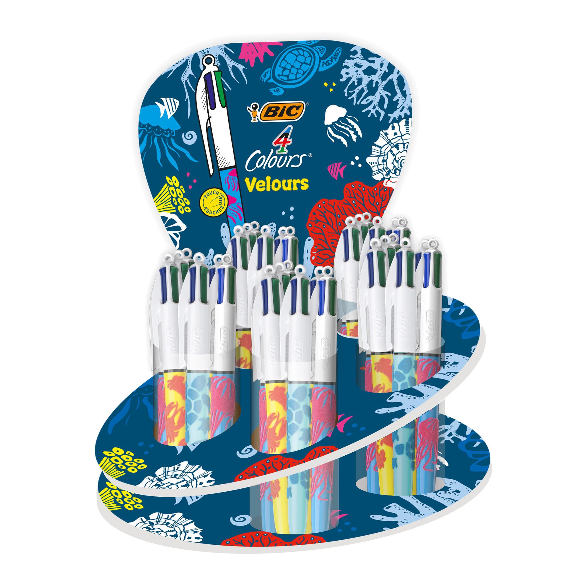 Espositore con assortimento di 60 penne a sfera BIC 4 Colours Velours con fusti ricoperti da un'esclusiva decorazione in velluto morbido al tatto in 3 temi assortiti: granchi, meduse e tartarughe.