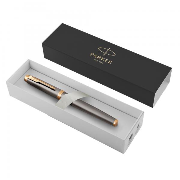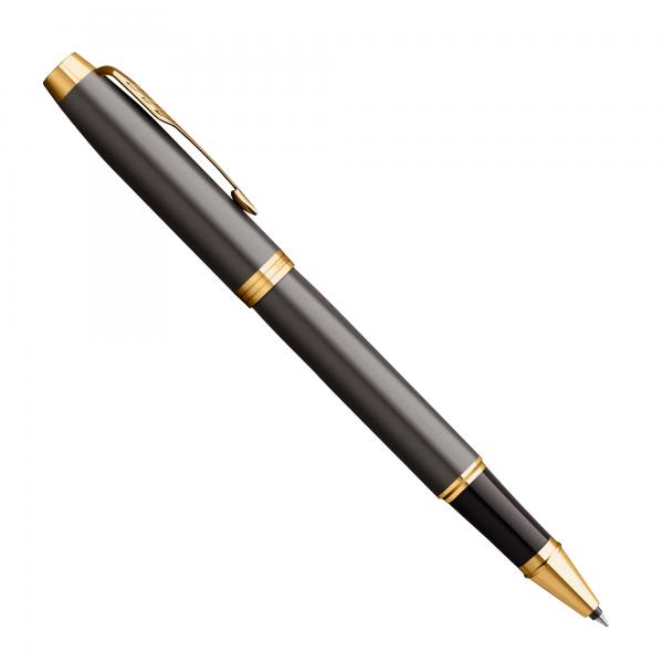 ELEGANTE PENNA ROLLER DOTATA DI FUSTO IN ACCIAIO INOX LACCATO GRIGIO ARRICHITO DA DETTAGLI IN ORO. INCLUSO REFILL NERO. FORNITA CON ESCLUSIVO ASTUCCIO PARKER.