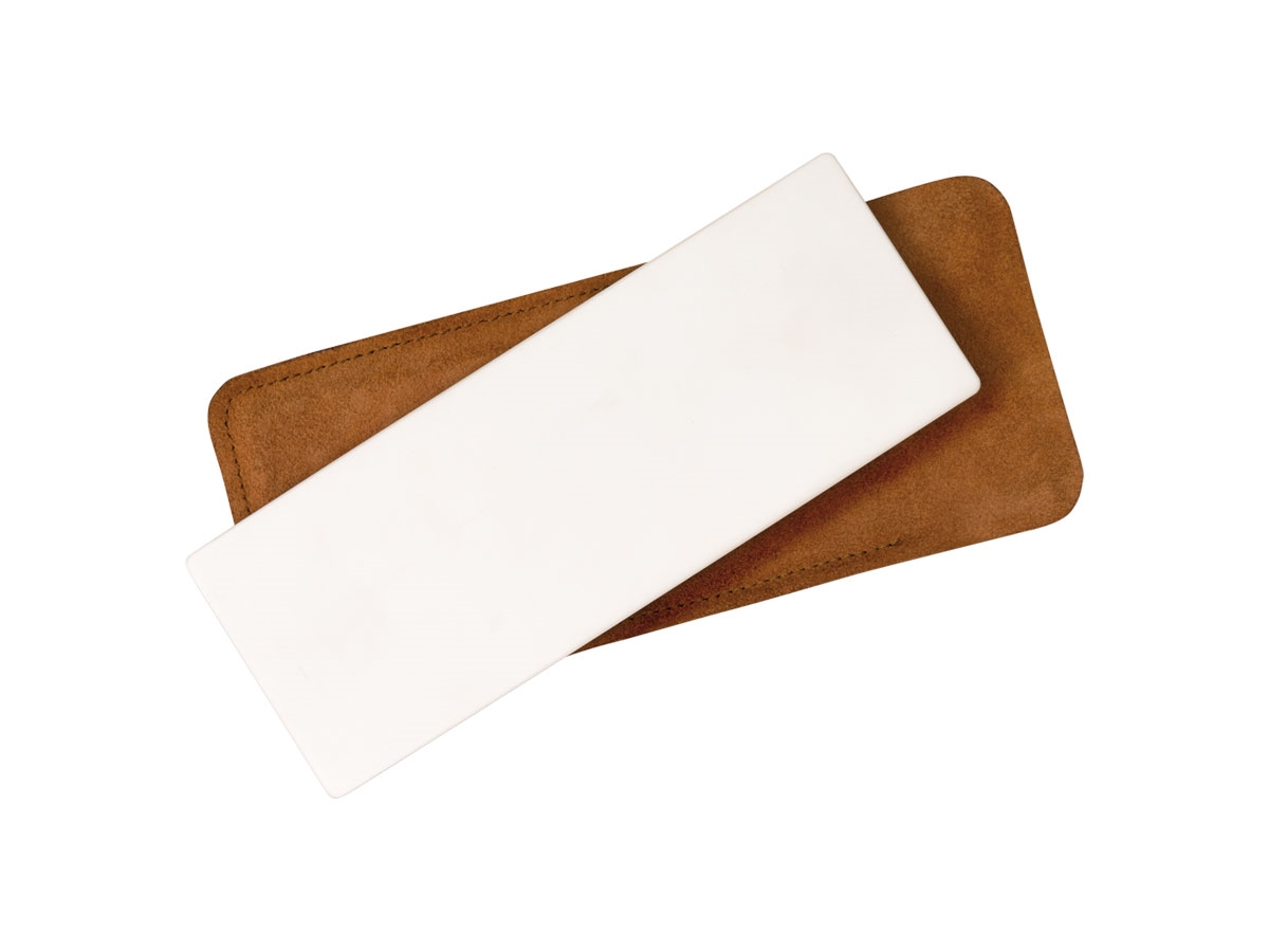 Questa pietra da banco in ceramica ultrasottile viene utilizzata come una pietra da affilatura tradizionale, ma non richiede olio o acqua. La sua superficie extra larga è ideale per affilare utensili per la lavorazione del legno e coltelli di grandi dimensioni e può essere facilmente pulita con un detergente domestico, un tampone abrasivo e acqua. Viene fornito in una custodia in pelle che funge anche da pattino antiscivolo durante l'affilatura.