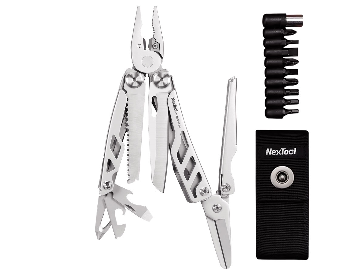 La pinza multiuso Flagship Max è stata migliorata sulla base della Flagship Pro per soddisfare la domanda dei consumatori. L'utensile multiuso è dotato di 14 piccoli accessori, tra cui pinze a becchi lunghi, pinze normali, tronchesi per fili morbidi e duri (YG8), tronchesi standard, coltellino tascabile, sega per legno, forbici, cacciavite a croce, cacciavite a testa piatta e apribottiglie, lima per metallo, rompivetro e righello. Ideale per attività all'aperto, campeggio, lavori domestici, fai da te quotidiano e altro ancora.