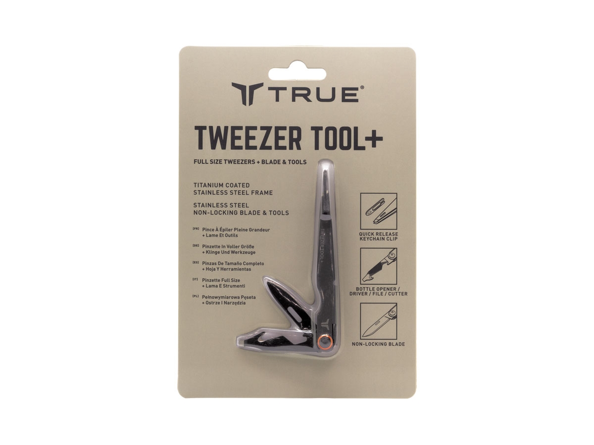 Il Tweezer Tool + è un micro toolkit essenziale con una lama da 4 cm ed una serie di strumenti utili da portare rivestiti in titanio.