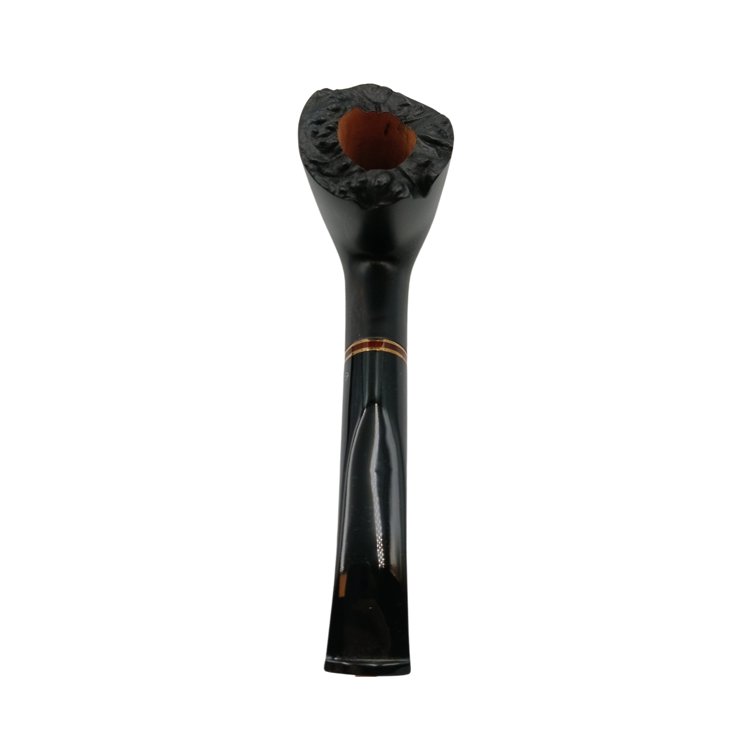 Il fornello presenta una rusticatura profonda sulla parte superiore, volutamente irregolare, che crea un contrasto estetico ricercato con il corpo liscio e opaco. Questa combinazione dona personalità alla pipa, rendendola un modello distintivo per fumatori che cercano qualcosa di diverso dal classico.