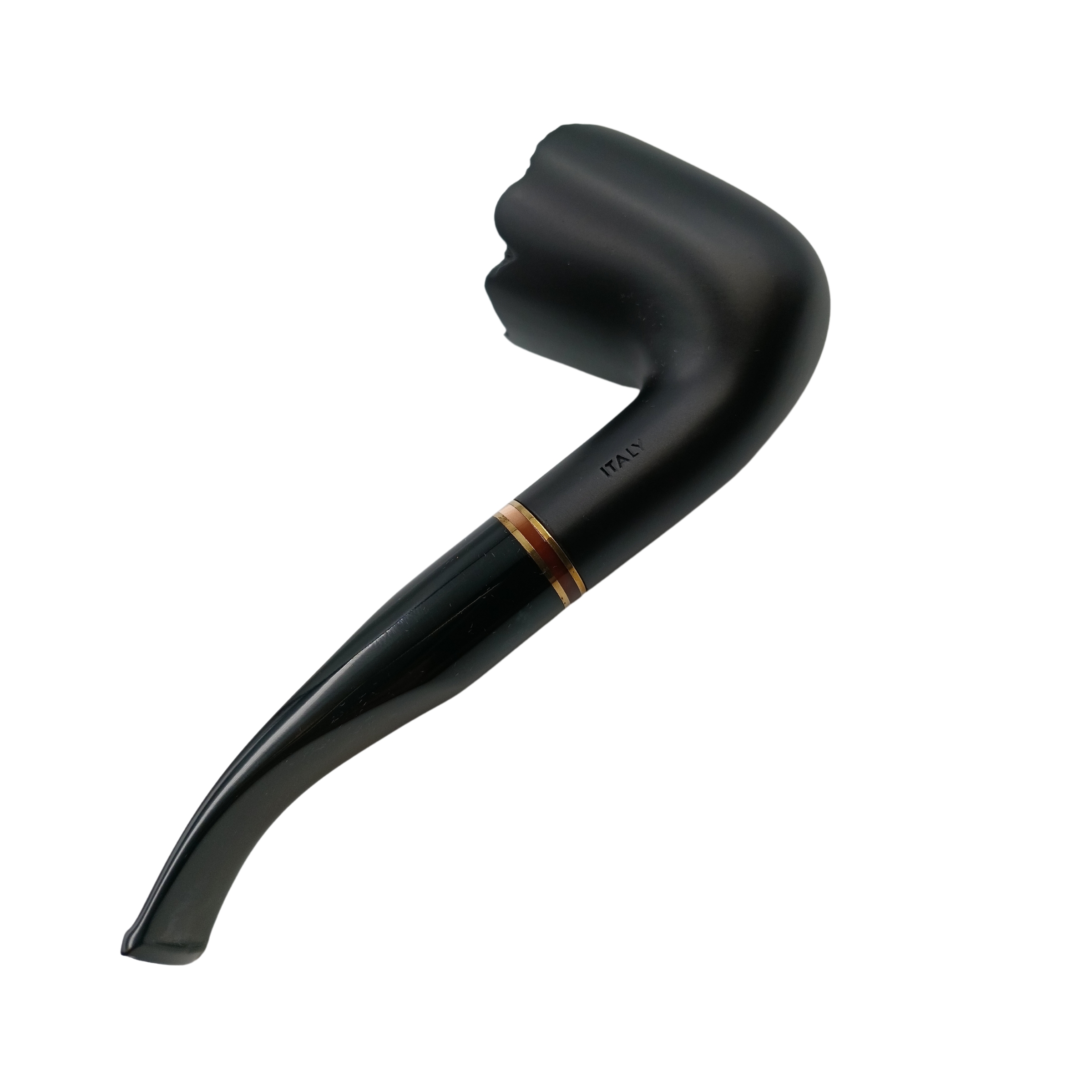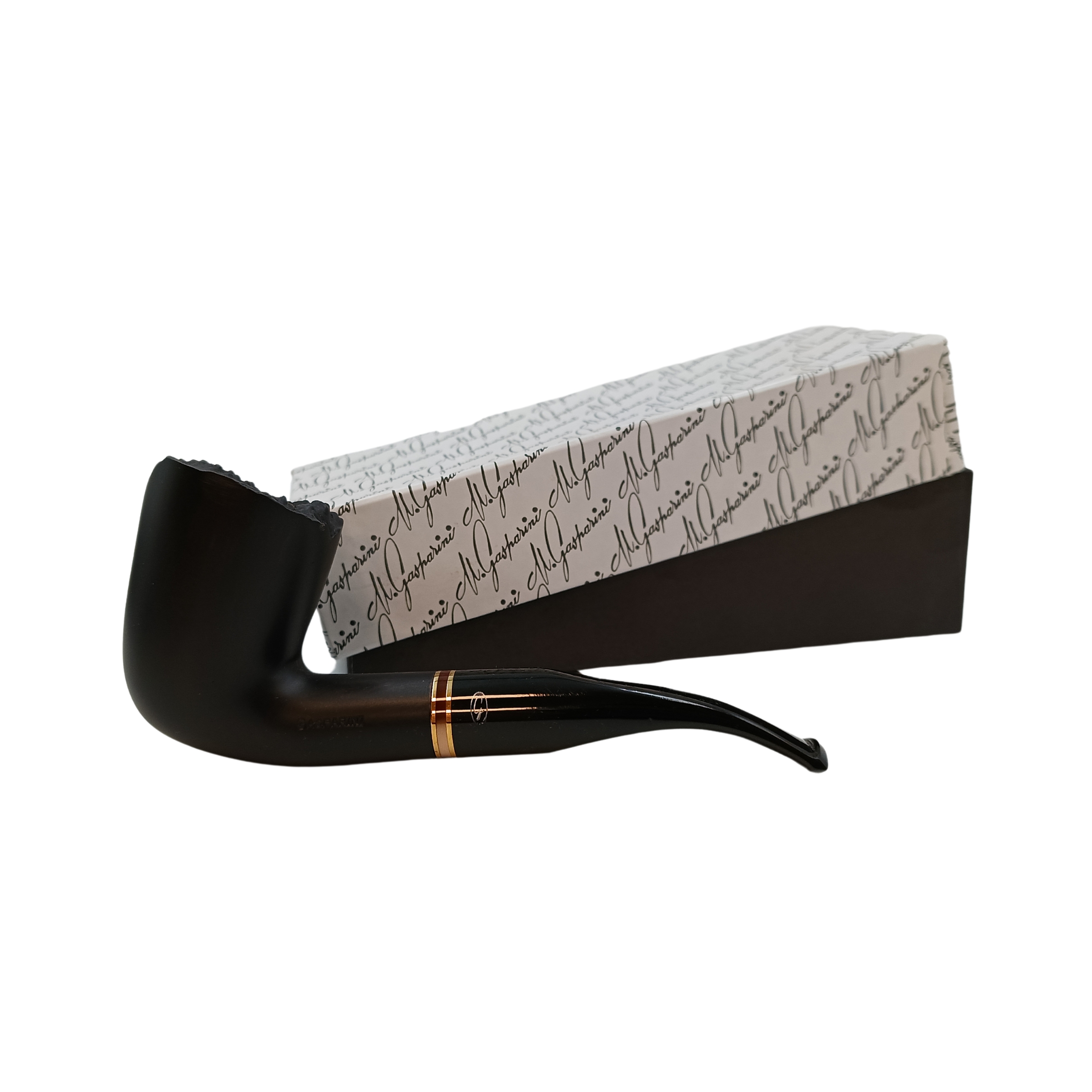 La Pipa Gasparini Fatta a Mano Bent Dublin rappresenta un'autentica celebrazione del design e della funzionalità. Questa pipa si distingue per le sue due verette oro che impreziosiscono l'insieme con un tocco di lusso e per l'inserto dallo splendido effetto madreperla, che cattura e riflette la luce, offrendo un contrasto affascinante con il nero opaco della radica. La finitura opaca della superficie non solo dona un'aspetto contemporaneo e sofisticato, ma accentua anche la sensazione tattile unica che solo una pipa rusticata può fornire.La forma Bent Dublin, con le sue linee pulite e l'angolo preciso, è pensata per adattarsi comodamente alla mano del fumatore, mentre il bocchino curvo promette una fumata rilassante e senza sforzo. Ogni pipa è un inno alla tradizione artigianale italiana, con misure studiate per assicurare la massima soddisfazione e un fumo di puro piacere.Caratteristiche Tecniche:• Materiale: Radica• Forma: Bent Dublin• Colore: Nero Opaco• Finissaggio: Opaco• Bocchino: Curvo• Lunghezza Totale: 146 mm• Profondità Fornello: 42 mm• Diametro Interno Fornello: 20 mm• Diametro Esterno Fornello: 40 mm• Filtro: 9 mm• Peso: 60,30 gr• Origine: Artigianato italiano di alta qualità - Pipe Gasparini!! ATTENZIONE !!Prodotto artigianale venature e colore potrebbero differire in base alle forniture. Utilizziamo immagini di prodotti fisici in alta definizione per il maggiore dettaglio possibile.La pipa viene fornita con sacchetto Gasprini e confezione semi rigida in cartone, rendendola un regalo ideale per gli appassionati o un'esclusiva aggiunta alla propria collezione di pipe di pregio.
