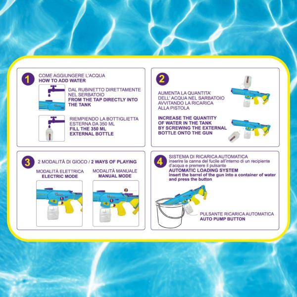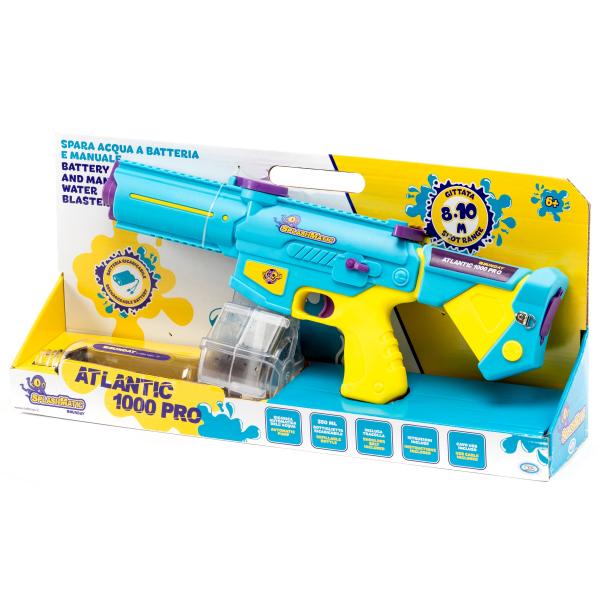 La pistola ad acqua Splashmatic Atlantic 1000 PRO è pensata per garantire un'esperienza di gioco dinamica e coinvolgente. Alimentata a batteria, questa innovativa pistola d'acqua offre prestazioni eccezionali e un divertimento continuo.• Ricarica USB: La comoda funzione di ricarica USB permette di ricaricare facilmente la pistola ad acqua, assicurando lunghe ore di gioco senza interruzioni. Potrai immergerti nelle battaglie d'acqua senza preoccuparti di rimanere senza carica.• Grande Capacità del Serbatoio: Con un serbatoio da 1000 ml, la Splashmatic Atlantic 1000 PRO ti consente di sparare a lungo prima di dover effettuare una nuova ricarica. La tecnologia di ricarica automatica del serbatoio rende tutto più semplice: basta immergere la punta della pistola nell'acqua, premere il bottone della ricarica e il serbatoio si riempirà automaticamente.• Portata Potente: Con una gittata che varia da 8 a 10 metri, questa pistola d'acqua ti permette di colpire i tuoi avversari anche da lontano, garantendo un vantaggio strategico in ogni battaglia. Grazie alla sua potenza, le battaglie d'acqua saranno ancora più emozionanti.• Contenuto della Confezione: La confezione include la pistola ad acqua, un pacco batteria ricaricabile, un caricabatteria USB, un tappo per la bottiglietta di ricarica e una tracolla per un comodo trasporto. Le dimensioni della pistola sono 43 x 19,5 x 9,5 cm, rendendola facile da maneggiare per bambini e adulti.La pistola ad acqua Splashmatic Atlantic 1000 PRO è perfetta per chi cerca un'esperienza di gioco unica e avvincente. Con le sue funzioni high-tech e la grande capacità del serbatoio, porterà il divertimento delle tue battaglie d'acqua a un livello superiore. Ideale per bambini, ragazzi e adulti, è l'accessorio perfetto per un'estate all'insegna del divertimento.Non adatto ai bambini di età inferiore ai 36 mesi a causa della presenza di piccole parti che possono essere ingerite o inalate. Si consiglia di lavare il prodotto con acqua dolce dopo l'utilizzo e di non mirare agli occhi o al viso.