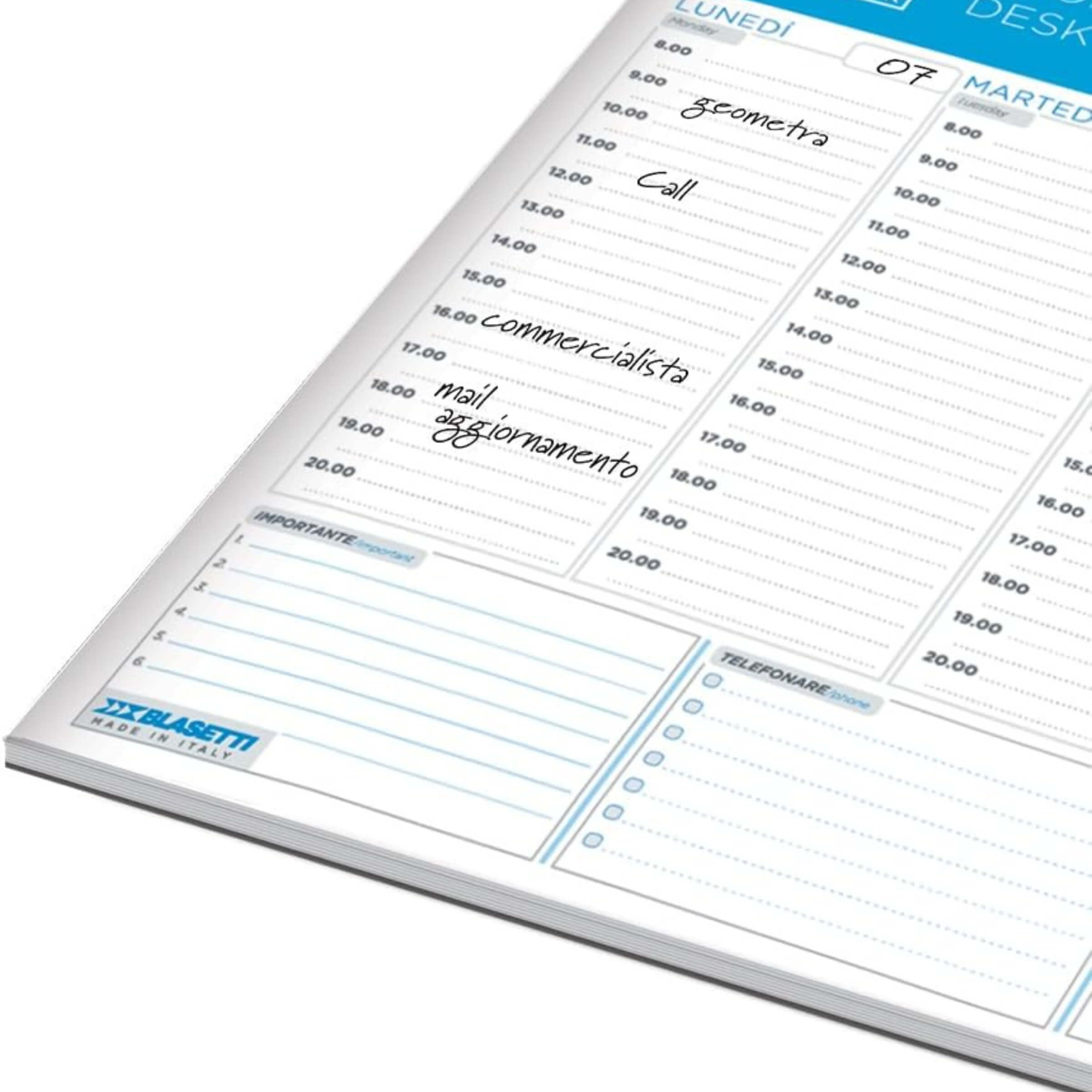 Organizzare al meglio il proprio tempo diventa semplice con il Planner Settimanale One Color, uno strumento pensato per tenere sempre sotto controllo impegni, appuntamenti e scadenze. Con il suo formato A3 da 43 x 30 cm e un design funzionale, offre una panoramica chiara della settimana, suddivisa in sezioni giornaliere per pianificare con ordine le attività. Ideale sia per l’ufficio che per l’uso domestico, questo planner combina praticità e qualità, grazie ai materiali robusti e alla stampa precisa.• 60 fogli da 80 grammi: Ogni foglio è realizzato in carta uso mano resistente, ideale per l’uso con penne e matite senza rischio di sbavature o trapassi di inchiostro.• Formato A3 (43 x 30 cm): Le dimensioni generose consentono una visione chiara e completa dell’intera settimana, con spazi dedicati a note, priorità e telefonate.• Struttura collata: Il planner è collato nella parte inferiore per garantire stabilità durante l’utilizzo quotidiano e facilitare il distacco ordinato dei fogli.• Grafica funzionale: Include sezioni per ogni giorno della settimana, più spazi dedicati a note importanti, telefonate da fare, mail da inviare e una griglia per appunti rapidi.• Conformità UE: Prodotto conforme al Regolamento UE 2023/988, realizzato con carta, inchiostri a base vegetale e adesivi sicuri, privi di sostanze nocive e certificati secondo le normative vigenti.• Materiali e finiture: Copertina in carta patinata e vernice UV protettiva, con eventuale finitura in polipropilene lucido o opaco per una resistenza superiore all’usura.Questo planner settimanale è l’alleato perfetto per chi desidera un’organizzazione accurata e senza stress. La combinazione di praticità, qualità dei materiali e design funzionale lo rende indispensabile per affrontare al meglio ogni settimana.