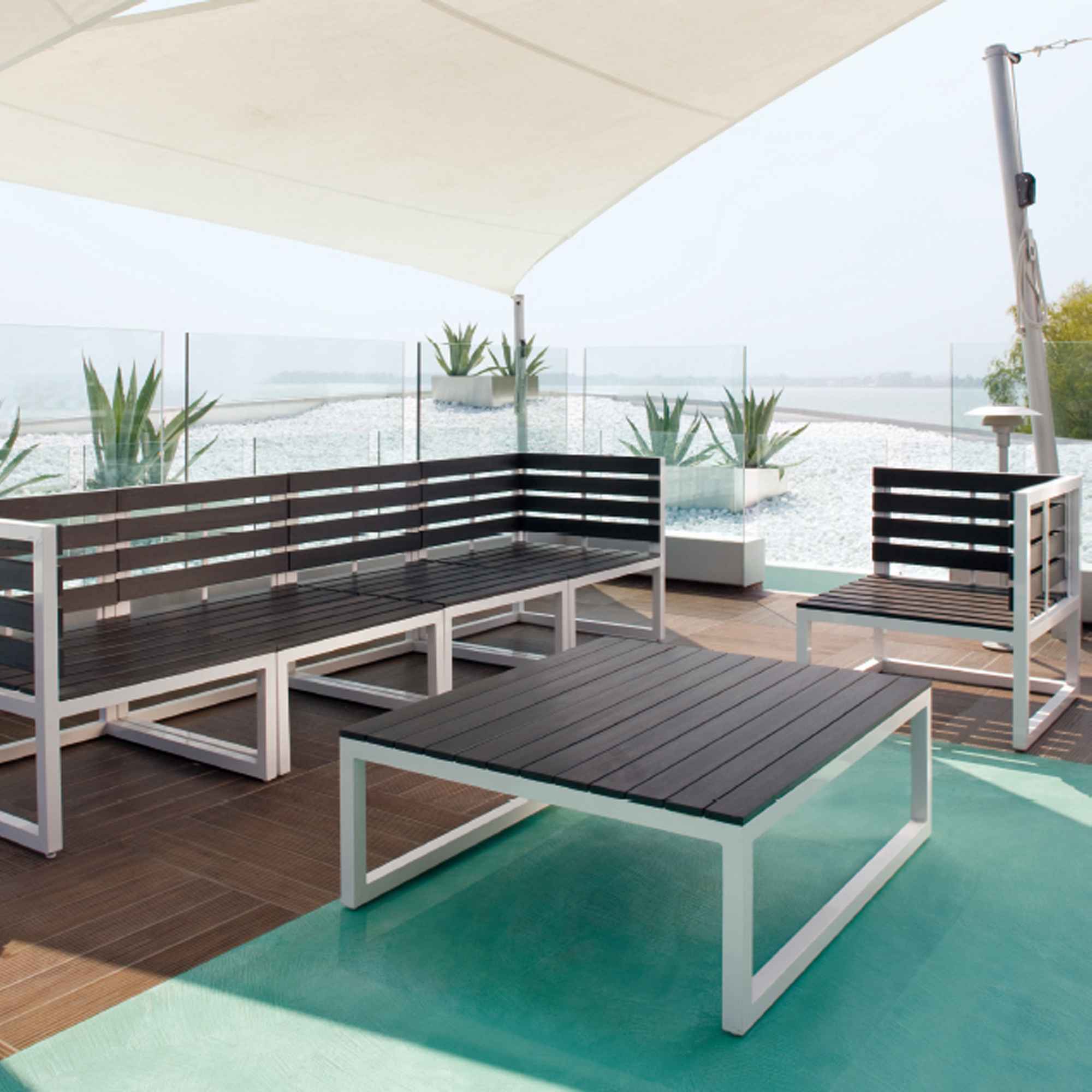 POLTRONA ANGOLARE SINISTRO DEL SALOTTO COMPONIBILE QUICK. MATERIALE BASE IN ALLUMINIO E TOP IN LEGNO. DIMENSIONI: 66X70X70CM